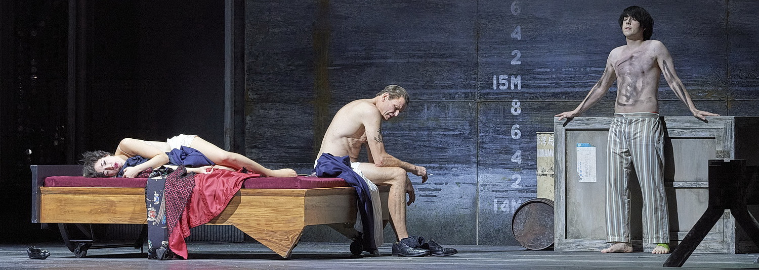 Trostlos und düster ist die prakti­kable Einheits­sze­nerie von Anna Viehbröck, die auch für die Kostüme verant­wortlich zeichnet: Ein beton­ar­tiger, grauer Einheitsraum, der sich geschickt in ein Schiff, einen Hafen, ein Zimmer oder eine Boutique verwandeln kann. Die seit Jahren einge­spielten Regis­seure Jossi Wieler und Sergio Morabito, letzteren hat Roscic als Chefdra­ma­turgen an die Staatsoper geholt, zeigen mit einfachen Mitteln ein Kammer­spiel der zerris­senen Seelen. Sie sind Könner der indivi­du­ellen Perso­nen­führung und sparen weder mit Gewalt noch mit Erotik.