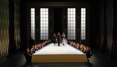 In diesem durchaus konven­tio­nellen Rahmen schafft Laufenberg eine ganze Reihe von opulenten, bisweilen berüh­renden Szenen. So im zweiten Bild mit den rund um ein Klavier gruppierten Damen des Chores. In einer besonders intimen Atmosphäre intoniert Silvia Hauer in der Rolle der Polina mit dunkel gefärbtem Mezzo Romanze und russi­sches Lied, das später der Chor übernimmt. Schlicht überwäl­tigend ist im vierten Bild die Szene mit Romina Boscolo als Gräfin, die von einem Fotoporträt überhöht wird. Es zeigt sie auf dem Gipfel ihres Ruhms als „Moskauer Venus“ in Paris. Wie die italie­nische Altistin in fließendem Franzö­sisch ihren Ekel vor der Welt Ah que se monde m’ennuie! erklärt und ihre Erinne­rungen an eine Zeit – Quelle époque! – beschwört, in der sie „selbst vor der Marquise de Pompadour gesungen“ habe, ist ganz großes Opernkino.