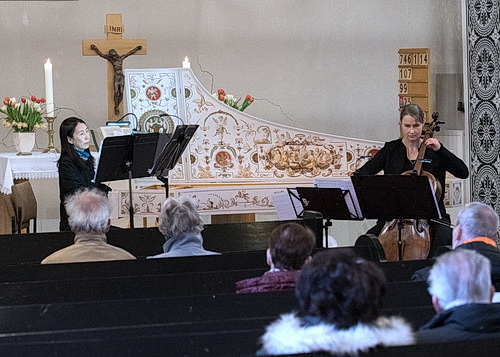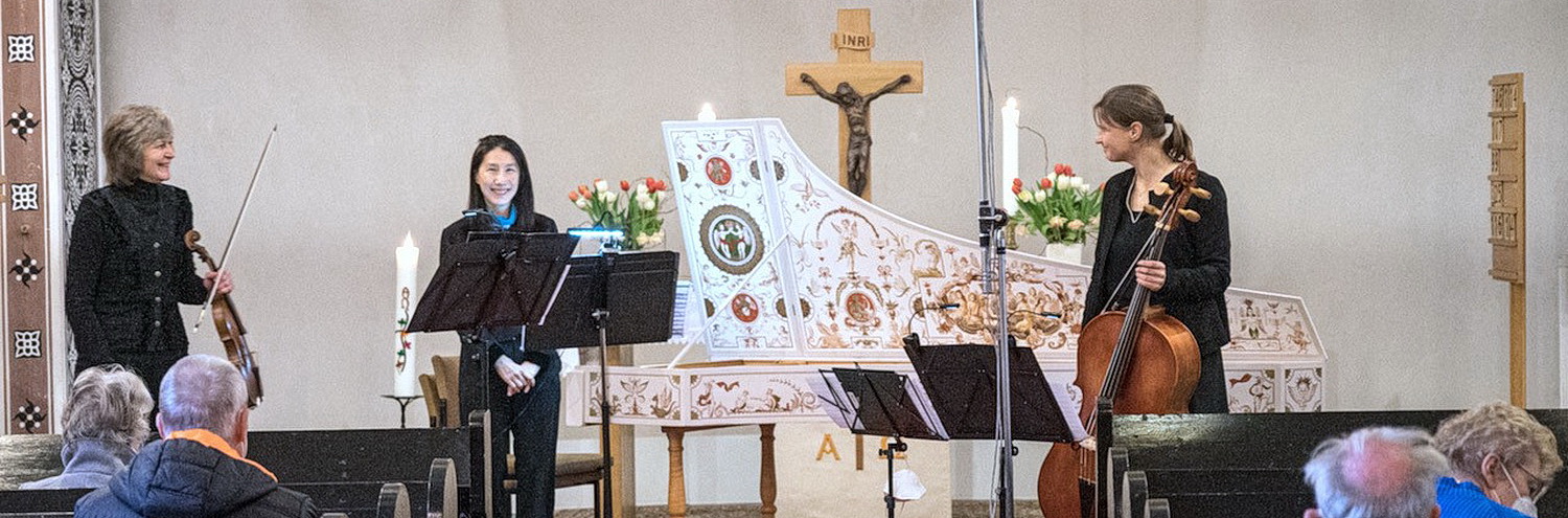 Die Frühlingssonne an diesem Nachmittag versucht ihr bestes, den kalten Wind zu erwärmen. Nur schüchtern zeigt sich frisches, grünes Laub auf den Bäumen rund um die Friedenskirche in Wildau. Nicht schüchtern sind die Besucher, die sich in die Kirche wagen, gesundheitverordnungskonform in Listen eintragen und ihre Maske aufsetzen. Endlich wieder ein Konzert, bei dem Publikum dabei sein kann! Eingeladen zur musikalischen Andacht haben das Baroque E‑Motion Trio mit drei Musikerinnen – Kerstin Linder-Dewan, Barockvioline, Beni Araki am Cembalo und Julia Kursawe spielt Barockcello und Cello Piccolo – zu einem Programm mit Musik von Johann Paul von Westhoff und Johann Sebastian Bach.