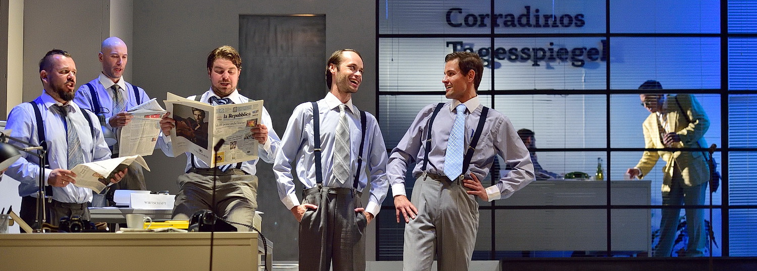 Ihre originelle Grundidee kollidiert zwar in etlichen Szenen mit der „Wahrheit“ dieser streckenweise skurrilen Komödie. Etwa dann, wenn das Schwert des militanten Corradino in der Bürowelt Serena Roccos, der für das Bühnenbild verantwortlich zeichnet, zu einem Brieföffner schrumpft. Etwa dann, wenn auf einem TV-Monitor „breaking news“ von einem militärischen Angriff künden, was den Redakteuren bedeuten soll, als Kriegsberichterstatter ins Feld zu ziehen. Insbesondere dann, wenn die Journalisten, im Original einfache Bauern, zu Protokoll geben, sie könnten schlicht nicht lesen. Die zahlreichen Ungereimtheiten nimmt das Publikum indes sicht- und hörbar in Kauf. Bonfadelli hat das Ernsthafte wie Komödiantische dieses Werks durchaus mit einem Augenzwinkern beim Wort genommen und dem Belcanto-Festival an der Enz im 31. Jahr seines Bestehens eine der vergnüglichsten Produktionen je geschenkt.