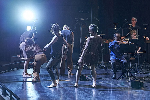 Der Auftakt des Festivals, das am Freitag­nach­mittag mit einem Konzert des WDR-Sinfo­nie­or­chesters zu Ende geht, ist im Märki­schen Museum fünf „Newcomern“ vorbe­halten, die in denkbar unter­schied­lichen Stilarten Werke für Bläser, Streicher und Klavier präsen­tieren. Ausge­führt von Nachwuchs­mu­sikern der Akademie des renom­mierten Ensembles Modern. Das hat am Abend mit zwei aufwän­digen Werken seinen großen Auftritt. Und zwar mit der filigran-komplexen, klanglich schil­lernden Auftrags­kom­po­sition Hopse des Altmeisters Georges Aperghis und der 40-minütigen, noch größer dimen­sio­nierten Tanzkreation Hard Boiled Varia­tions des Heidel­berger Kompo­nisten Arnulf Herrmann, die fünf Mitglieder der Cocoondance-Compagnie mit minima­lis­ti­schen Bewegungs­studien szenisch beleben.