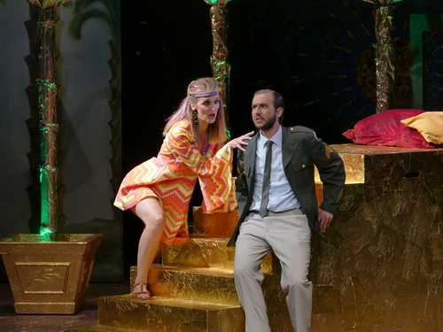 Während Händels Musik die emotionalen Verwerfungen von Verliebtheit, Liebesrausch, Trauer, Verzweiflung bis hin zu Rachegelüsten recht realistisch nachempfinden lässt, lebt das Bühnengeschehen von eher unwirklichen Wendungen. Alles scheint letztlich wie ein Traum, wie ein Rauschzustand. Und so versetzt Regisseur Holger Klembt im Würzburger Theater in der Bibrastraße das Ganze in eine Gesellschaft von jungen Menschen, bei denen manches an eine Hippie-Kommune erinnert. Diese bunt zusammen gewürfelte Gesellschaft besteht aus etwas überdrehten Aussteigern mit Liebeleien und Konflikten unter Paaren. Dieses muntere Hin und Her ist eine deutlich theatralische Versuchsanordnung, die am Schluss glücklich ausgeht, weil die Beteiligten endlich zur Realität zurückkehren und froh darüber sind, dass alles ja gar nicht so ernst gemeint war, dass man ein nettes Spielchen veranstaltet hat, wobei wenigstens die Gefühle kurzzeitig echt waren. Dieses Spielerische wird immer wieder klar, etwa durch Umbauten auf offener Bühne oder wenn Morgana in vorgetäuschtem Liebeskummer über die scheinbare Untreue ihres Oronte bittere Tränen vergießt und dabei reichlich mit Papiertaschentüchern um sich wirft. Alles das ist nur Mittel zum Zweck, auch die Handy-Fotos des Oronte von schönen Frauen im Publikum oder im Orchester, denn durch die gegenseitige Eifersucht kommen sie schließlich doch wieder zusammen. Auch der putzige Stoff-Löwe, angeblich der verzauberte Vater des Oberto, spielt augenzwinkernd darauf an, dass hier alles nur Theater ist um Liebe, Macht über andere, Aufbegehren gegen die zugewiesenen Rollen.