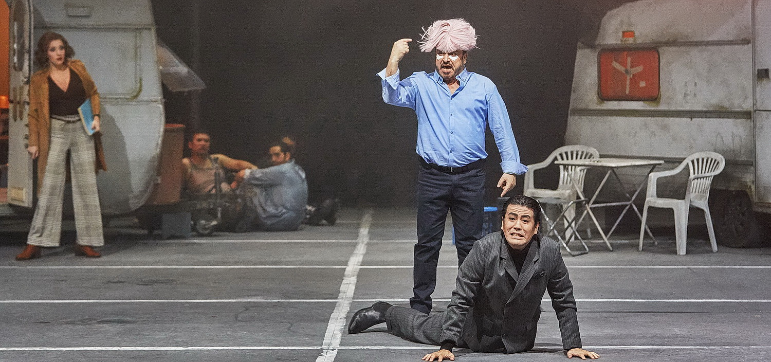 Dieser im Grund inhomogene Aufbau des Werks veranlasst Dominique Horwitz in seiner gelungenen Inszenierung am Mainfranken-Theater Würzburg dazu, den Aspekt der Realität zu betonen, den improvisatorischen Zug des Ganzen hervorzukehren und zwei ganz verschiedene Teile zu schaffen, die aber durch das Ziel, Kunst zur Unterhaltung zu bieten, zusammengehalten sind. So lässt Ausstatter Pascal Seibicke das Vorspiel auf einem düsteren, nebligen Vorstadt-Platz mit zwei Camping-Anhängern stattfinden, wo das „fahrende Volk“, das auch mit Rollkoffern ankommt, auf die Anweisungen seines Geldgebers wartet. Schon erscheint der Haushofmeister, Georg Zeies, und verkündet, was der reiche Auftraggeber von seinen Künstlern wünscht, nämlich eine kurzweilige Kombination von Drama und Komödie. Unmöglich!, finden die Vertreter der ernsthaften Kunst auf der linken Seite, die die etwas zwielichtigen Darsteller der leichten Unterhaltung auf der rechten Seite verachten. Primadonna und Sexy-Girl geraten aneinander. Zwischen allen Lagern aber steht die verzweifelte Komponistin, die ein Musiklehrer zu trösten versucht und ein Tanzmeister aufheitern will. Erst das Einverständnis zwischen der von allen Zerwürfnissen erschöpften Komponistin und der lebensklugen Zerbinetta beendet den Streit. Pause. Schnitt.