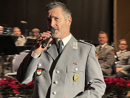 Zum Schluss des Konzertes wird es dann doch noch adventlich und weihnachtlich. Moderator Thomas Althöh konnte sich mit einem kleinen Augenzwinkern einen kleinen Seitenhieb auf die Stadt Würzburg und die fehlende Weihnachtsdekoration im Saal nicht verkneifen. Doch das Heeresmusikkorps sorgt dafür, dass Weihnachtsstimmung aufkommt. Mit jeweils zwei Fantasien über Lasst uns froh und munter sein und Macht hoch die Tür, arrangiert von Dominik Schneider, wird die festliche Zeit nun auch musikalisch eingeleitet, die mit dem Jingle-Bell-Rock von Joseph Beal und James Boothe mit herrlichen Swing-Klängen seinen Abschluss findet. Natürlich werden die Musiker an diesem Abend nicht ohne Zugabe entlassen. Zunächst erklingt der Laridah-Marsch von Max Hempel. Hempel trat 1895 als Militärmusiker in die bayerische Armee ein. Ab 1903 absolvierte er ein Studium an der Akademie der Tonkunst in München. Als Musikmeister übernahm er am 1. Juli 1906 die Regimentskapelle des 1. Infanterie-Regiments in München, mit der er auch am 1. August 1914 ins Feld zog. Seine wohl bekannteste Komposition, der Marsch Laridah, entstand im Jahre 1918 in Frankreich. Er geht zurück auf eine altenglische Melodie des Liedes Laridah. Als zweite Zugabe erklingt eine weitere Fantasie des Arrangeurs Dominik Schneider, nämlich über O du fröhliche, die fast wie eine symphonische Dichtung daherkommt. Noch einmal erklingt Macht hoch die Tür, diesmal in der Originalversion, und die Zuschauer im Saal sind eingeladen, zum Abschluss des Konzertes das Weihnachtslied mitzusingen.
