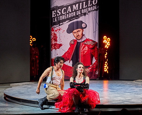 In Georges Bizets Oper Carmen von 1875 treten auf der Bühne der Blauen Halle des Würzburger Mainfrankentheaters gleich zwei Carmen auf, eine manchmal nur sprechend, ansonsten stumm daneben, in grellrotem Plastikkleid, die Schauspielerin Laura Storz, die andere, die eigentliche Carmen, die Sängerin und Darstellerin Vero Miller, ständig präsent, vorwiegend kämpferisch in Schwarz. Warum ein solches Duo? Warum ein Alter Ego für die Carmen, als Unterstützung oder als Kommentatorin bei ihren Handlungen? Eigentlich ist eine solche Gestalt nicht nötig, denn durch das schlüssige Spiel sollte dem Publikum ohnedies klar sein, dass Carmen unbedingt ihre Freiheit will, auch wenn sie dabei zugrunde geht.