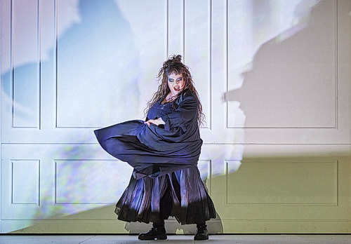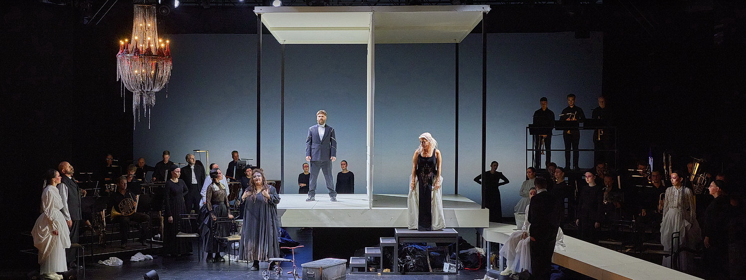 Ein erhöhter weißer Kubus, nach vorne offen, in der Mitte der Bühne, ein angedeutetes Haus, hier des Atriden-Palastes, davor geschäftige, weiß und sauber gekleidete Dienerinnen, darunter aber, in der dunklen Tiefe, Müll, altes Zeug, Trümmer eines Kronleuchters, und inmitten dessen eine schwarze Lumpen-Frau mit zotteligen Haaren: Elektra, Tochter des Hauses, der man Brocken zuwirft. So beginnt, vor rot ausgeleuchtetem Hintergrund, die Oper Elektra von Richard Strauss in der Blauen Halle des Mainfrankentheaters Würzburg. Der Komponist hatte 1908⁄09 zusammen mit seinem Librettisten Hugo von Hofmannsthal ein einaktiges Musikdrama nach der reduzierten Vorlage von Sophokles, weit ab von der bei Goethe humanen Sicht auf die Antike, geschrieben. Mit der gewaltigen Besetzung von 115 Musikern hatte er dafür ein mitreißendes, riesiges Klanggemälde über das Hass-Inferno am Hof der Atriden geschaffen. Dass solches auf die engen Verhältnisse in der Ausweich-Spielstätte passen könnte, daran zweifelt so mancher vorher. Doch erstaunlicherweise funktioniert es. Denn Generalmusikdirektor Enrico Calesso hat eine leicht reduzierte Fassung entworfen, aber nicht auf eine verstärkte Besetzung für sein engagiert mitgehendes Philharmonisches Orchester verzichtet. So sitzen die Blechbläser samt Wagner-Tuben rund um das Atriden-Haus oben auf der Bühne, und das übrige Riesen-Orchester ist im Graben platziert. So ist das Rauschhafte, Überwältigende, Aufwühlende zu hören, und dennoch haben auch Lyrisches, schwelgerisch-romantische Momente Platz, besonders in den Passagen mit der menschlich fühlenden Chrysothemis und bei der Erkennungsszene Elektra-Orest.