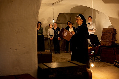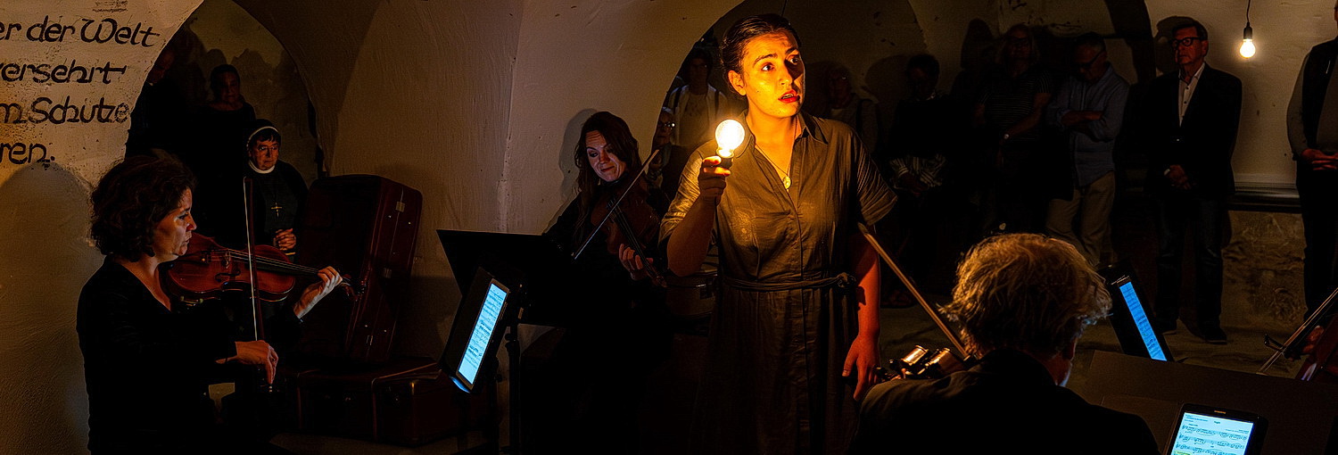 All das schlägt einen Bogen zum diesjährigen Motto des Musikfestivals Schuld und Sühne. Das Besondere an der eineinhalbstündigen Abfolge von Szenen, mit Kammermusik aus allen möglichen Winkeln der Räume, von der punktuellen Reise durch 400 Jahre Musikgeschichte, von Mozart über Schumann, Wagner, Mahler, Brahms bis Eisler, Copland und Coates, mit Lyrik, aber auch Originalberichten von Augenzeugen der Katastrophe der Bombennacht vom März 1945, welche nahezu 95 Prozent der historischen Altstadt vernichtete, dabei auch das Mutterhaus der Nonnen: Auch die Ordensschwestern sind an der Aufführung beteiligt, lesen vor, wirken mit in einzelnen Szenen in den damals wie durch ein Wunder in den von der Zerstörung erhaltenen Räumen, im Speisesaal, der Küche und vor allem unten im Keller, und das Publikum kann sich einen authentischen Eindruck abholen von der Enge, der Bedrohung und Bedrängnis, die damals herrschte, und das unfassbare Glück nacherleben, dass hier im Keller 200 Soldaten und 300 Ordensfrauen sowie Nachbarn überleben konnten, während draußen alles Leben im Feuersturm unterging.