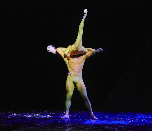 In Le sacre du printemps ist die Choreografin Anna Vita in ihrem ureigenen Element, macht daraus ein in sich stimmiges, mitreißendes Tanz-Mysterium. Nichts vom Skandal bei der Uraufführung ist hier zu verspüren. Eher könnten Traditionalisten sich heute noch aufregen über die zahlreichen Dissonanzen, die extremen Klangverschärfungen, die zerrissene Motivik oder Rhythmik. Was vielleicht mancher Zuschauerin bitter aufstößt, ist die Gewalt der Männer an einer unschuldigen Frau. Doch man darf nicht vergessen: Strawinsky schildert hier ein altes, überholtes Ritual aus einer heidnischen, russischen, sagenhaften Vergangenheit, stellt diese erbarmungslose Opferung als barbarischen Akt mit grandios dazu passender Musik dar. In Würzburg befindet sich auf der mit Blättern bestreuten Bühne im Hintergrund eine Art zylindrischer Klotz, vielleicht ein Altar-Block. Alles beginnt mit der „Anbetung der Erde“, in der sich schon in den Trikots und deren Farben die Gegensätze manifestieren: Die „Jungen“, in Gelb, betanzen und beschwören den Frühling, der mit grünem Licht suggeriert wird. Um sie herum im Kreis befinden sich die „Alten“, angetan mit fleckigem Rot-Braun. Vor diesen führen die fünf jungen Leute eine Art Erweckungstanz auf. Bald zeigt sich auch der Anführer der „Alten“, indem er dem Altar-Podest entsteigt. Fast willenlos, hilflos, zitternd ist das Mädchen, das spätere Opfer, im „Entführungsspiel“ dem „Weisen“ ausgeliefert, lässt sich trotz der Bemühungen ihrer Kameraden nicht von ihm weglocken. Bewundernswert, wie Kaori Morito in ihren Bewegungen, mal weich, mal angespannt starr, mal wie befreit, dann wieder in zitternder Abwehr ihre inneren Befindlichkeiten ausdrückt, wie mutig sie sich hoch werfen lässt, wie akrobatisch sie alle unglaublich schwierigen Figuren meistert und wie flexibel sie mit ihrem zarten, schmiegsamen Körper das schicksalhafte Opfer eines Mädchens in diesem gewalttätigen Ritual nahe zu bringen weiß, bis zum Schluss, als sie zum Riesen-Tutti des Orchesters auf den Paukenschlag genau in den Altar geworfen wird. Ihr Partner und Widerpart ist der Weise, der Alte, der Mann. David Bassenz tanzt ihn mit starker körperlicher und männlicher Ausstrahlung, mit hohen, präzisen Dreh-Sprüngen; dass ihm dieses Mädchen verfällt, wird deutlich auch durch außergewöhnliche Hebungen und Pas de deux, die eher durch Unterwerfung als von Miteinander geprägt sind. Auch die übrigen Ballett-Nummern, synchron und einfallsreich vom Ensemble ausgeführt, fesseln durch nonverbale Ausdruckskraft, etwa auch durch das primitiv-brutale Stampfen der Alten beim Ritus für die Ahnen und durch die Kongruenz zur Musik Strawinskys. Das Orchester unter Calesso bietet hier wieder eine hoch präzise Leistung bei den schreienden, zerrissenen Passagen, den Schichtungen, den rauschhaften Fortissimi, den heftigen Betonungen bis hin zum erbarmungslosen Schlag am Schluss, bei dem auch der Alte fällt. Vielleicht das ein Hinweis darauf, dass solch menschenverachtende Rituale heute vorbei sind.