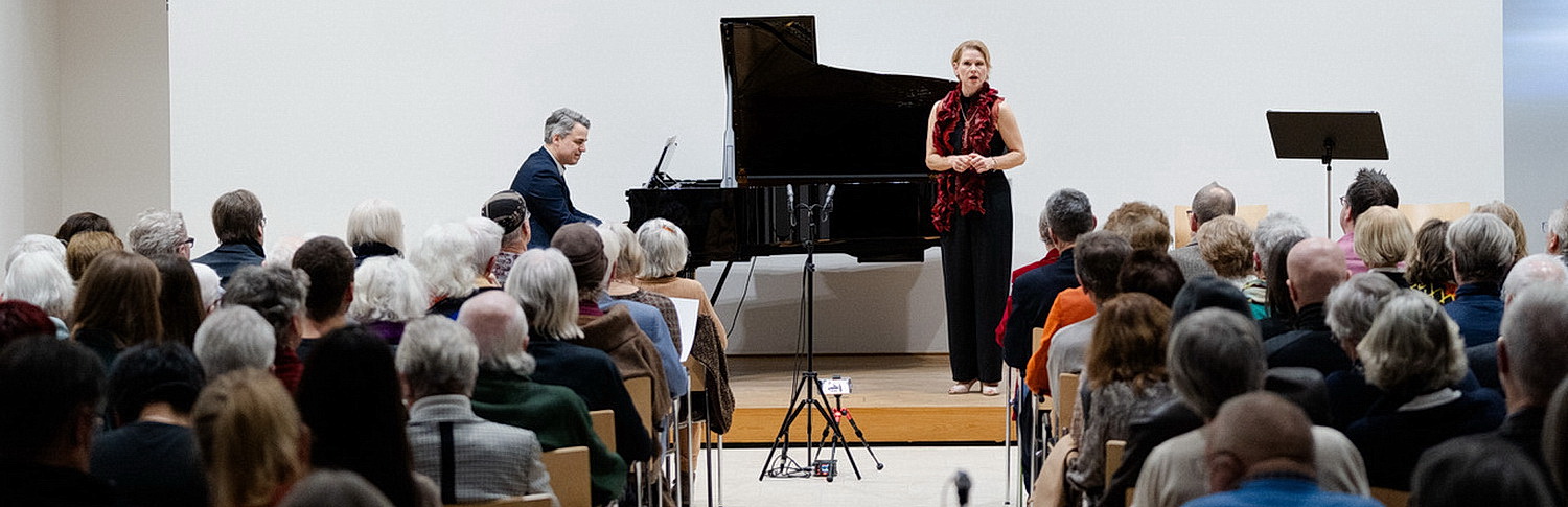 Fast 200 Zuhörer finden schon zum ersten Konzert der Reihe den Weg ins Burkardushaus in Würzburg, wo Sopranistin Evers und Bariton Schöne mit Fleischer am Klavier zunächst Lieder von Franz Schubert, Rudi Stephan, Hugo Wolf, Arnold Schönberg, Claire Waldoff und Otto Reutter zu Gehör bringen. Irdisches Glück ist der Abend überschrieben und bietet den beiden Vollblut-Darstellern genügend Möglichkeit, intensive Gefühle, aber auch humoristische Einlagen glaubhaft zu vermitteln.