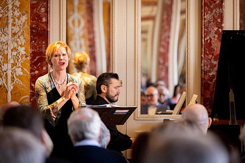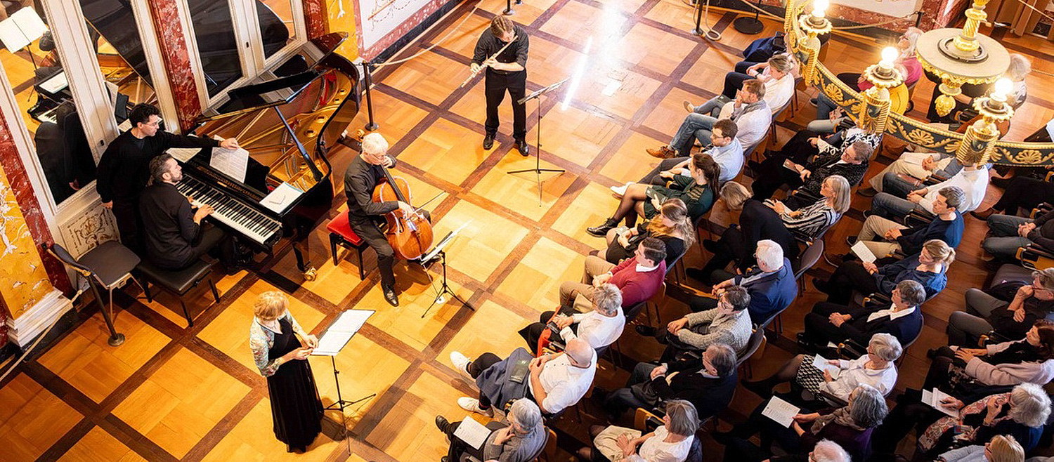 Der Frühlingsanfang, Sonnenschein auf dem Residenzplatz in Würzburg und mit dem Toscanasaal ein Raum, in dem man sich kaum etwas Schöneres vorstellen kann, als Musik zur Natur: überbordende Blumenmalereien, Blütenranken, Obstarrangements und die verschiedensten Vögel zieren die Wände zwischen den Stuckarbeiten. Reiher, Tauben, Kraniche, ein Distelfink, Greifvögel und ein Schwan lassen den Betrachter schon vor dem Konzert in die rechte Stimmung kommen, der Musik zu lauschen, die bukolische Landschaften, Hirten, Schäfer und sogar orientalisches Flair evoziert. Das vierte Kammerkonzert des Philharmonischen Orchesters am Mainfrankentheater in Würzburg kommt in einer schlanken Besetzung daher: Silke Evers, Sopran, Stefan Albers, Flöte, Matthias Steinkrauß, Cello und Enrico Calesso holen die Sonnenstrahlen in den Saal.