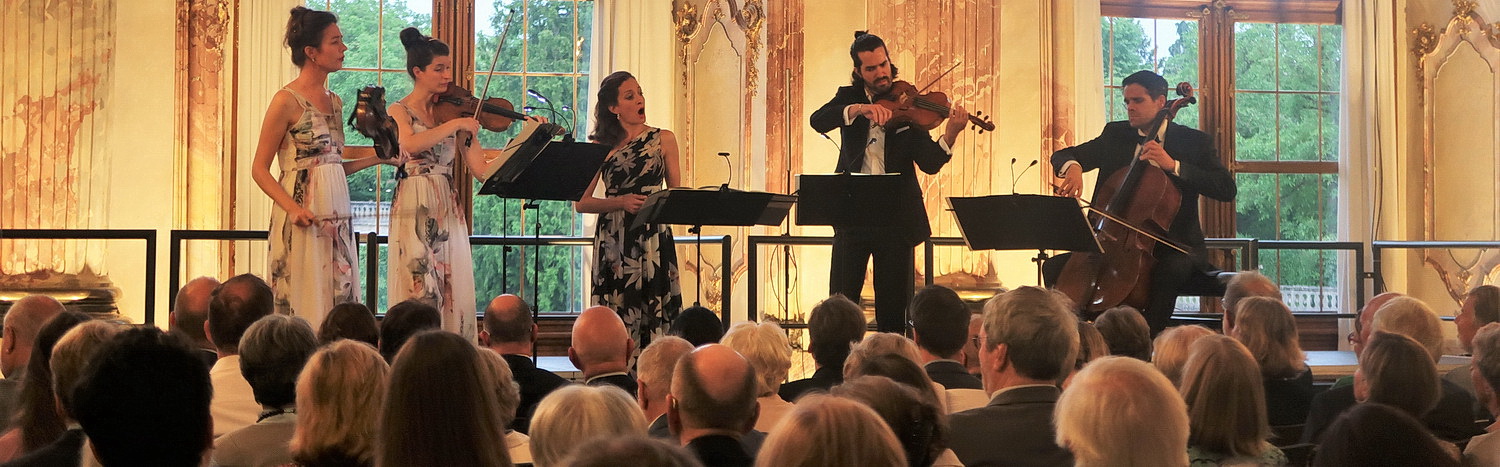 Widerstreitende, unerwiderte Gefühle, das zieht sich als thematische Verbindung durch einen hochkarätigen Liederabend mit der weltweit gefeierten Sopranistin Christiane Karg und dem international renommierten Aris Quartett im Kaisersaal der Würzburger Residenz beim Mozartfest. Der Abend könnte überschrieben sein mit unerfüllter Sehnsucht nach menschlicher Nähe, nach Freundschaft. Ungewöhnlich ist dabei eigentlich die Kombination von Streichquartett und Singstimme für Lieder. Aribert Reimann, 2024 verstorbener Komponist, hat für das „romantische“ Repertoire die üblichen Klavierbegleitungen neu instrumentiert, sie so mit neuen Farben oder mit eigens geschaffenen Intermezzi zwischen den Liedern versehen, die wie kurze „Kommentare“ zum Gehörten oder als Vorbereitung für Kommendes dienen. Bei den Transkriptionen für Streichquartett zu den Liedern lässt sich Reimann ganz auf die emotionale Aussage der Texte ein, lässt die oft bewusst fragil und transparent gehaltenen Streicher-Klänge ganz mit der Stimme verschmelzen, so dass beide Partner zusammen ein sanft schimmerndes Tongemälde bilden.