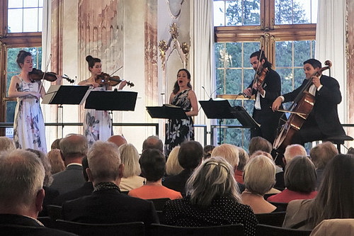Als rein instrumentale Bereicherung zu den Lied-Schöpfungen bewährt sich Wolfgang Amadeus Mozarts so genanntes Dissonanzenquartett Nr. 19 C‑Dur KV 465 als sehnsüchtige Distanzierung vom schweren Alltag durch musikalische Schönheit, gerade im Gegensatz der schroffen Einleitungs-Takte des ersten zum Gesanglichen des zweiten Satzes spürbar. Dass Mozart dieses und fünf weitere Quartette seinem Freund Haydn gewidmet hat, der gerade dieses, anders als die Zeitgenossen, sehr geschätzt hat, sei nur am Rande erwähnt. Das vielfach ausgezeichnete Aris Quartett, Katharina Wildermuth und Noemi Zipperling, Violinen, beide Damen in duftigen Sommerkleidern, und Caspar Vinzens, Viola, sowie Lukas Sieber, Violoncello, harmonieren bestens; die Violinen legen mit ihrem lichten, transparenten Spiel ein seidiges Gespinst über die samtig dunklen Streicher. So breitet sich nach den langsamen, schmerzvollen Einleitungs-Takten bald Freundlicheres, Schnelleres, Anmutiges aus, alles von innerer Spannung getragen. Versöhnlicher Wohlklang bestimmt das Andante, dem ein subtiles Menuett voller Elan mit einem eher gedankenschweren Trio folgt und dann von einem aufmunternden, charmant gesteigerten Finale abgelöst wird. Das fein gestaltete Quartett bildet gleichsam einen Ruhepol unter den Lied-Kompositionen. Sie beginnen mit der Vertonung von Goethes Gedicht Mignon durch Franz Schubert, mit der schmerzvollen Sehnsucht nach einem Freund, nach Frieden, letztlich nach Erlösung durch den Tod von allen irdischen Leiden. Damit ist die Aussage-Linie des Liederabends vorgegeben. Aus dem weich schmeichelnden, fein ziselierten Ton der Streichinstrumente erhebt sich sanft der helle, klare, lichte Sopran von Christiane Karg, formuliert kostbar klingend das Leiden an der Einsamkeit, die Wehmut, den Traum nach Verklärung in schimmernden Höhen. Auch Robert Schumanns Herzeleid op. 107⁄1 über die unglückliche Ophelia lässt in Kargs Gestaltung feines Mitgefühl spüren. In den Fünf Ophelia-Liedern WoO 22 von Johannes Brahms spiegelt sich, gedämpft in den Streichern, unendliche innere Trauer, die auch durch die Schönheit des Gesangs, die bewegte Schilderung des Valentinstags, das Klagen über den Tod, den verlorenen Geliebten, das unerbittliche Leid und die Bitte an Gott kaum gemildert werden kann. Der ausgedehnte Zyklus … oder soll es Tod bedeuten? von Felix Mendelssohn Bartholdy nach Gedichten von Heinrich Heine, eine Auftragskomposition für Aribert Reimann 1996 für die Schwetzinger Festspiele, bei der er auch teilweise bei der Transkription vom ursprünglichen Klaviersatz abwich, aber zwischen den Liedern mit sechs instrumentalen Intermezzi die atmosphärische Stimmung für die Gedicht-Vertonungen verstärkte, kündet eindrucksvoll von Fragen nach der Befindlichkeit menschlicher Existenz in der Welt. Das bekannte Frühlingslied Leise zieht durch mein Gemüt Liebliches Geläute beginnt fein bewegt, weitet sich lieblich; gleich aber schlägt die Stimmung um zu Herbstlichem in dramatischen Bewegungen und Gedanken an Einsamkeit. Der Wunsch nach Friedvollem lässt dann alles sanfter, idyllischer, heller erscheinen in feinen Färbungen des Soprans, und Auf Flügeln des Gesangs erklingt wunderbar licht, kostbar; die Stimme vollzieht hier die Bewunderung der Natur nach, beschwört einen seligen Traum, bevor verhalten wieder traurige Stimmung aufkommt. In all jenen Gefühlsregungen verbindet sich der Sopran homogen mit den Streichern, leuchtet in vielen delikaten Schattierungen, deutet damit den stets gut verständlichen Text aus. Naturbilder wie der Mondenglanz vermitteln sich unmittelbar als Ahnung von tiefer Empfindung. Alles endet klagend, irgendwie mutlos, in einer abgebrochenen, nie beantworteten Frage, ungelöst.