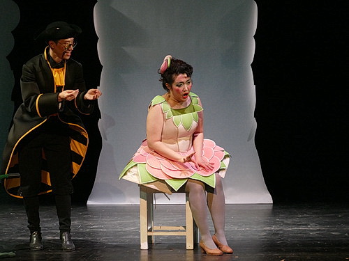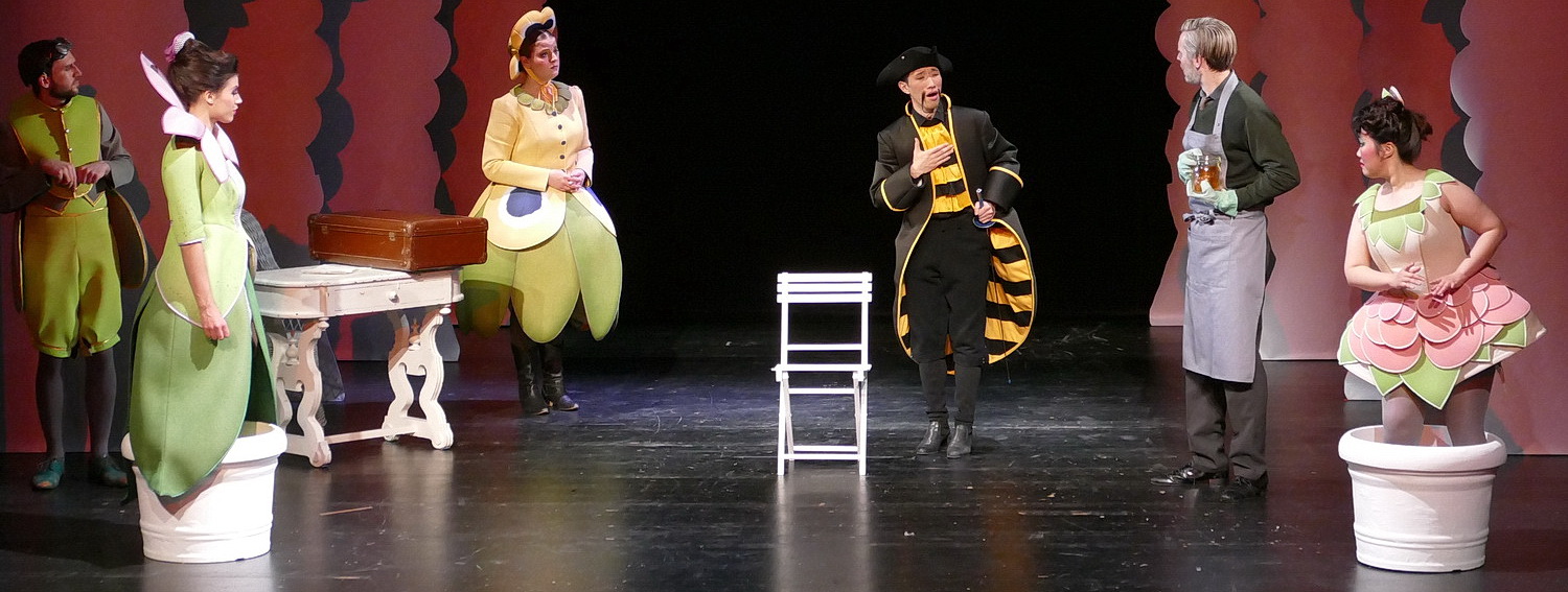 Schon bei der Ouvertüre muss Robin Engelen, der das Projektorchester sehr umsichtig leitet, öfter lächeln, betont aber auch gelegentliche dramatische Aufwallungen; insgesamt dominiert hier Liebliches, Schwungvolles, Witziges. Das führt hinein in die Gartenidylle der Familie von Geronimo; Blumen, Gräser, gaukelnde Schmetterlinge, Insekten sind zu sehen auf dem sich ständig verändernden Bühnenbild von Sibylle Pfeiffer mit den Projektionen von Katrin Nicklas. Je nach Stimmungslage zeigen die Stoffbahnen auch Rosen für Liebe oder rosa Wölkchen für Zukunftsträume oder Gewitter bei Auseinandersetzungen. In einem eigentlich freundlichen Umfeld wohnen Geronimo, der Gärtner und seine beiden Töchter, personifizierte zarte oder stolze Blüten, sowie ihre Tante Fidalma, schon voll erblüht; Gärtnergehilfe Paolino scheint dank der fantasievollen Kostüme von Moritz Haakh ein Zwitter zwischen Grashüpfer und jungem Mann, und dass der sehnlichst erwartete Graf Robinson sich dank seines Äußeren als Biene – mit Gastgeschenk Honig – entpuppt, ist ein besonderer Gag. Erst am Schluss, in der nächtlichen Szene, als sich alle Geheimnisse enthüllen und verziehen werden, sind die Akteure ins Menschlich-Allzumenschliche zurückgekehrt: Mit dem gestreiften Schlafanzug von Geronimo korrespondieren die ebenso gemusterten Kulissen-Vorhänge, und alle Beteiligten tragen nun gewöhnliche Nacht-Kleidung.