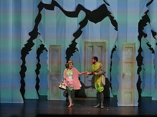 Die köstliche Inszenierung von Katharina Thoma sprüht nur so vor Einfällen. Ständig sind die Akteure in Bewegung; mit einfachsten Mitteln verstärkt die Regisseurin ihre Ideen. Wenn sich Tante Fidalma Mut antrinkt, bedient sie sich aus einer Flasche mit Blumendünger, Geronimo wehrt sich gegen den Grafen in einer Aufmachung als Imker, und ihre Auseinandersetzung fechten sie per Bienen-Stachel und mittels Spritz-Düse aus; den Traum von einer Flucht aus der Abhängigkeit von Geronimo „realisieren“ Paolino und Carolina mit einem aus einem Blumenkübel selbstgebastelten Flugzeug. Schirme helfen bei der Abwehr von Missverständnissen oder Regen. Daneben werden die Charaktere der einzelnen Personen auch im Auftreten deutlich. Geronimo wirkt väterlich-besorgt, und dass er schlecht hört, vieles nicht versteht, wird mit Großbuchstaben auf den Übertiteln unterstrichen. Dass Elisetta stolz ist, sich hochtrabend benimmt, verdeutlicht schon ihr glattes Äußeres; Carolina dagegen verkörpert mit ihrer rundum bodenständigen, mädchenhaft hübschen Erscheinung die Naive, Liebenswerte, von allen Konflikten ständig hin- und hergerissen. Sie ist die eigentliche Heldin der Geschichte. Auch sängerisch gebührt dieser Carolina von Hyunmin Kim die Palme, denn ihr voller, farbenreicher, höhen- und tiefensicherer Sopran meistert die Partie mühelos, kann auch in der Arie Perdonate, signor mio mit Witz und Temperament überzeugen. Megan Henry passt mit ihren manchmal etwas grellen Höhen und mit ihrem kräftig hellen Sopran bestens in die Rolle der eifersüchtigen, ehrgeizigen Elisetta, während Nina Schumertl mit ihrem sicher gestaltenden Mezzo als Fidalma vor allem in ihrer Sehnsuchtsarie nach einem Ehemann È vero che in casa ihr komisches Talent auslebt. Aber auch die Männer in dieser Aufführung sind eine Klasse für sich: Gustavo Müller stellt äußerst glaubhaft den gutmütigen, aber bestimmten Geronimo dar, mit angenehm festem, nicht allzu dunklem Bass, hat offensichtlich viel Spaß auch bei seiner mehrdeutigen Arie Udite, tutti udite! – er selbst hört ja schlecht. Stefan Schneider als Paolino wirkt äußerst sympathisch und singt mit schön timbriertem Tenor unangestrengt, voller Ausdruck. Der Graf, Conte Robinson, wird von Dong Won Seo sehr agil und umtriebig gezeichnet, zäh in seinen Wünschen, und seine Zungenfertigkeit im geschwinden Parlando oder auch die lyrischen Qualitäten seiner flexiblen Stimme sind zu bewundern. Schön anzuhören sind die harmonisch ausgewogen klingenden Ensembles und die Final-Sextette, bei Cimarosa zur Steigerung der menschlichen Affekte eingesetzt.