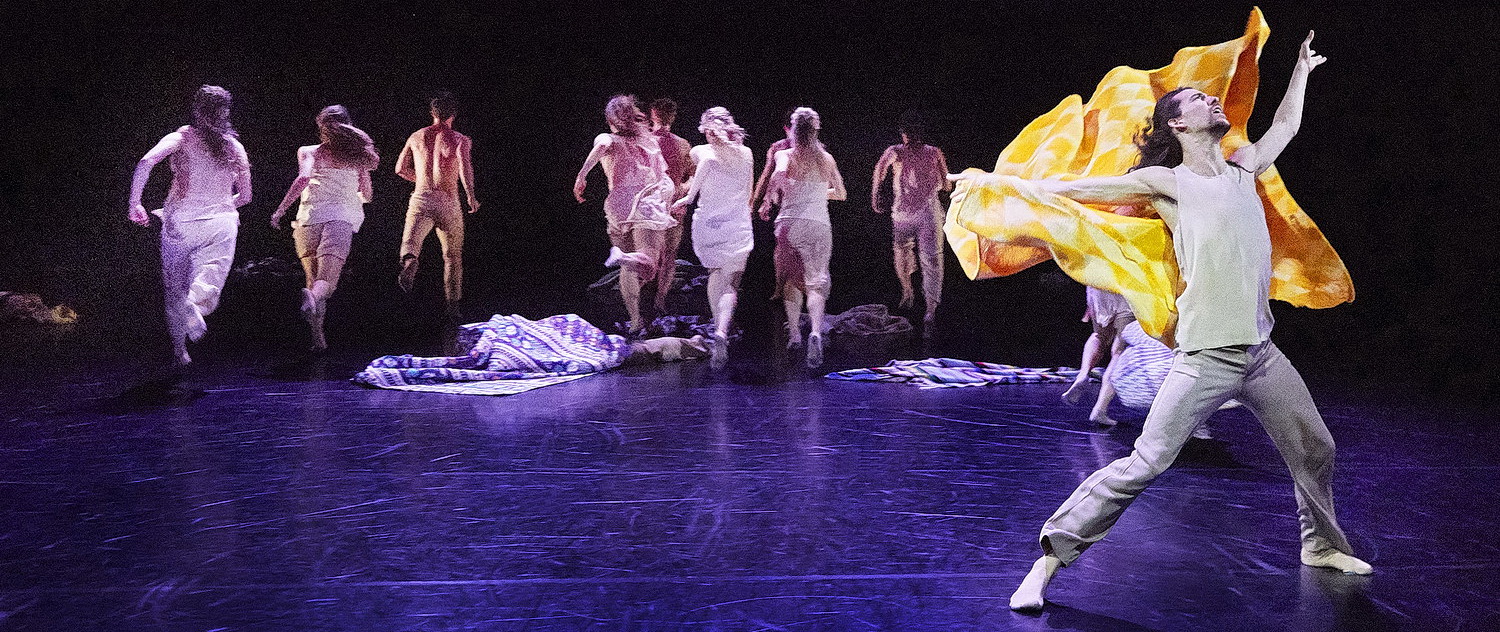 Zum beein­dru­ckenden Erfolg dieses außer­ge­wöhn­lichen Tanzabends trägt vor allem auch die Ausstattung von Tatyana van Walsum bei. Um dieses Sich-Zuhause-Fühlen anzudeuten, nimmt sie Decken, die in ihrer bunten Mischung an Natio­nal­flaggen erinnern könnten, hängt sie vor schwarzem Hinter­grund über Gestelle, die sich heben und senken. Im zweiten Teil liegen diese Decken dann auf dem Boden, bilden auch eine Art Straße, und die Tänze­rinnen und Tänzer können sich wie zum Schutz in die bunten Tücher einhüllen. Alle tragen helle, leichte, fleisch­farbene Kleidung, wenig geschlechts­spe­zi­fisch, aber im Schnitt etwas unterschiedlich.