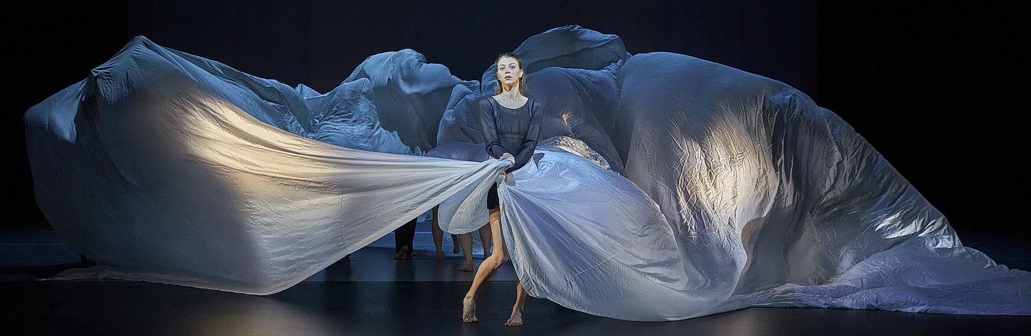 Dieser abstrakte, „reine“ Tanzabend wird getragen von der eher schlichten Ausstattung von Tatyana van Walsum mit einer Bühne, die sich zu Anfang vorne erschließt, sich dann immer mehr öffnet, durch das Fallen von Vorhängen den Blick immer mehr frei gibt auf neue Räume; die Stoffbahnen sind zuerst dunkel, werden dann immer heller und durchsichtiger, dienen einerseits als Spielmaterial, unter dem man sich verstecken kann, aber auch als Hüllen, in die man sich einwickelt oder als Schleppe hinter sich herzieht. Die Tanzenden, zuerst in weich fleischfarbenen Hosen oder Hemdchen, später in Rot, schließlich in Schwarz erscheinend, werden vom Licht von Mariella von Vequel-Westernach weiß angestrahlt, wenn sie sich aus der Gruppe heraus profilieren; am Schluss aber erscheint die ganze Gruppe unbeleuchtet als vielfiguriger Schattenriss. Der Einzelne besitzt so keine individuelle Ausstrahlung mehr, und doch wirken die Körper imponierend vor dem nunmehr nach hinten weisenden weißen Vorhang, der schließlich als transparente, flatternde Hülle, als bewegte „Welle“ am Boden für einen verdeckten Abgang sorgt.