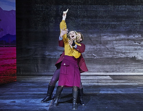 Und während er sich maliziös der Personenführung widmet, sehen Bühnenbildnerin Isabelle Kittnar und Kostümbildnerin Katharina-Maria Diebel die Aktualität des Werkes im Kriegsbezug. Damit sich das erschließt, muss man allerdings Hintergrundwissen in der Fotografie mitbringen. 2011 erregte Fotograf Richard Mosse viel Aufsehen mit seiner Serie Infra. Er versuchte, die Gräuel des Bürgerkriegs im Kongo – einer der vergessenen Kriege – adäquat zu dokumentieren, indem er spezielles Filmmaterial verwendete, das die Infrarot-Schichten eines Bildes sichtbar werden ließ. Kittnar und Diebel versuchten, diesen Effekt auf der Bühne nachzuempfinden. Zwar ist das Foto-Panorama der spartanischen Bühne durchaus eindrucksvoll, aber in der Farbigkeit wirkt die Bühne über weite Strecken eher wie in einem Blutrausch oder um es milder auszudrücken: unter einem roten Schleier zugedeckt. Durchbrochen wird diese Eintönigkeit von Mariella von Vequel-Westernach, die mit ihrem Licht und großzügigem Nebeleinsatz nicht nur dezidierte Höhepunkte setzt, sondern der Szenerie insgesamt eine hochprofessionelle Note verleiht, die man so bei einem Stück dieser Größenordnung nicht erwartet hätte. Insbesondere die einzige „Kriegsszene“ gerät unter diesem Licht und mit der Musik von Adrian Sieber zum Glanzpunkt des Abends. Sieber verwendet als Zwischenmusiken Ausschnitte aus The Dark Side of the Moon von Pink Floyd, was nicht nur klanglich, sondern auch thematisch höchst treffend gewählt ist. Umso unverständlicher ist, wenn er bei einigen Zwischenmusiken die Musik nicht verklingen lässt, sondern höchst unpassend abbricht. Da passt die abstrakte Darstellung der Örtlichkeiten schon besser, wenn man lediglich mit Hilfe eines verschieblichen Balkens und eines gemustert bemalten Vorhangs zwischen Hauptbühne und hochgezogenem Graben auch ohne große Erklärungen auskommt.