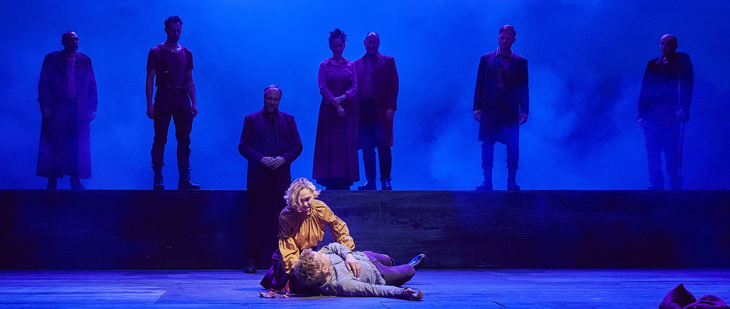 Und während er sich maliziös der Personenführung widmet, sehen Bühnenbildnerin Isabelle Kittnar und Kostümbildnerin Katharina-Maria Diebel die Aktualität des Werkes im Kriegsbezug. Damit sich das erschließt, muss man allerdings Hintergrundwissen in der Fotografie mitbringen. 2011 erregte Fotograf Richard Mosse viel Aufsehen mit seiner Serie Infra. Er versuchte, die Gräuel des Bürgerkriegs im Kongo – einer der vergessenen Kriege – adäquat zu dokumentieren, indem er spezielles Filmmaterial verwendete, das die Infrarot-Schichten eines Bildes sichtbar werden ließ. Kittnar und Diebel versuchten, diesen Effekt auf der Bühne nachzuempfinden. Zwar ist das Foto-Panorama der spartanischen Bühne durchaus eindrucksvoll, aber in der Farbigkeit wirkt die Bühne über weite Strecken eher wie in einem Blutrausch oder um es milder auszudrücken: unter einem roten Schleier zugedeckt. Durchbrochen wird diese Eintönigkeit von Mariella von Vequel-Westernach, die mit ihrem Licht und großzügigem Nebeleinsatz nicht nur dezidierte Höhepunkte setzt, sondern der Szenerie insgesamt eine hochprofessionelle Note verleiht, die man so bei einem Stück dieser Größenordnung nicht erwartet hätte. Insbesondere die einzige „Kriegsszene“ gerät unter diesem Licht und mit der Musik von Adrian Sieber zum Glanzpunkt des Abends. Sieber verwendet als Zwischenmusiken Ausschnitte aus The Dark Side of the Moon von Pink Floyd, was nicht nur klanglich, sondern auch thematisch höchst treffend gewählt ist. Umso unverständlicher ist, wenn er bei einigen Zwischenmusiken die Musik nicht verklingen lässt, sondern höchst unpassend abbricht. Da passt die abstrakte Darstellung der Örtlichkeiten schon besser, wenn man lediglich mit Hilfe eines verschieblichen Balkens und eines gemustert bemalten Vorhangs zwischen Hauptbühne und hochgezogenem Graben auch ohne große Erklärungen auskommt.