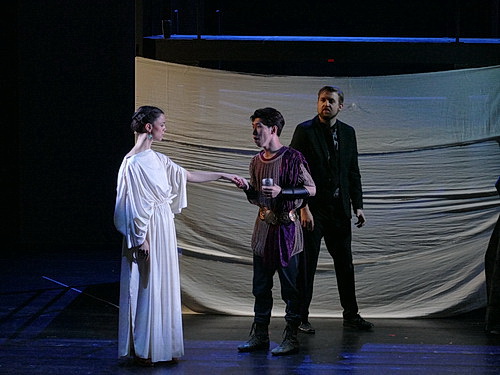 Auch wenn die Handlung der Oper und ihr Ende heute vom Publikum weniger angenommen werden, ist das ganze Werk musikalisch äußerst reizvoll. Es changiert zwischen Anspielungen auf den Frühbarock, etwa auf Purcell in der großen Passacaglia im Schlussbild oder in ariosen und rezitativischen Stellen und illustrierenden Passagen, etwa beim Herannahen des Tarquinius oder der „romantischen“ Morgenstimmung und dem immer wieder aufscheinenden Leitmotiv der Lucretia. Dass hier aus heutiger Betrachtung erzählt wird, verdeutlichen das sehr geschickte, wandlungsfähige Bühnenbild und die Kostüme von Ausstatterin Verena Hemmerlein. Anfangs sind rechts und links die beiden Chor-Erzähler hinter Redner-Pulten positioniert; sie mischen sich aber bald ins Geschehen ein. Auf schwarzen Blöcken sitzen die Schüler in Schuluniformen mit Emblemen ihres Internats, verfolgen den Geschichtsunterricht. Danach verkleiden sie sich in die Figuren der Handlung mit antik wirkenden Kostümen, etwa als Krieger oder Römerinnen. Dabei weitet sich ihr Horizont: Eine Art Podest in der Mitte der Bühne stellt zuerst das Heerlager dar, in dem die Unterhaltung der Offiziere sich, vom Wein beflügelt, immer mehr um Liebe und die lasterhaften Frauen in Rom dreht; nur eine Ausnahme gibt es: Lucretia. Das reizt den Prinzen Tarquinius immer mehr, ihre Treue zu erproben. Sein Ritt nach Rom und die Überquerung des Tiber, angedeutet mit Bewegungen und einfachen Mitteln, gestützt durch die Musik, führt hin zum zweiten Bild, dem Haus der Lucretia, in dem sie und ihre Dienerinnen typisch weibliche Tätigkeiten verrichten, wie das Ausbreiten und Falten weißer Leinenbahnen. Mit ihnen umhüllen sie schließlich das Gestänge des Podests, so das daraus eine Art Gehäuse entsteht, das Schlafgemach der Lucretia, ein intimer, geschützter, abgeschirmter, privater Bereich. Da dringt später Tarquinius ein, zerrt Lucretia heraus und vergewaltigt sie. Im Vorgriff auf das kommende Verbrechen veranstalten inzwischen die Internats-Zöglinge eine Demo gegen die Etrusker zu einer Projektion des antiken Rom. Die Vergewaltigung selbst findet zu schrillen Klängen statt, angeklagt als Sünde unserer Natur. Einen starken Kontrast zu der düsteren Nacht bildet der kommende, strahlende Morgen mit hellem Licht; die Dienerinnen arrangieren Blumen, Symbole der Reinheit. Doch trotz der beschwörenden Worte von Collatinus und Junius kann sich Lucretia nicht beruhigen. Sie braucht das Leben nicht mehr und ersticht sich. Ist das alles? fragt der Text, und an den aufgestapelten Blöcken wird daraufhin das Gewand der Lucretia aufgehängt, wie eine Erinnerung an Christi Tod und gleichzeitig Hoffnung auf eine bessere Zukunft. Ob sich diese erfüllt, bleibt zweifelhaft. Ganz sanft klingt die Musik nach der menschlichen Tragödie aus.