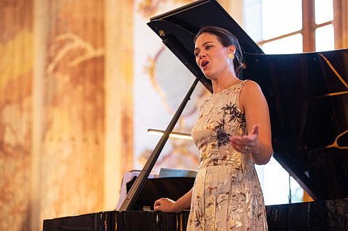 Die charmante Sängerin in ihrem geschmackvollen Kleid fühlt sich sichtlich wohl in dem prachtvollen Saal, steht scheinbar entspannt vor dem Flügel und unterstreicht mit Gestik, Lächeln und Mimik den Inhalt der vertonten 22 Gedichte, ein anspruchsvolles, ambitioniertes, umfangreiches Unterfangen. Ihre große, klare, hellglänzende Stimme mit den mühelosen Spitzentönen, einer schönen Mitte und einer angenehm schlanken Tiefe kann sich frei entfalten, gestaltet die Vokale etwas offen, so dass der Text nicht immer so ganz verständlich zu vernehmen ist; im Mittelpunkt ihres Vortrags aber steht eher das Strahlen ihres Soprans als die vertiefte Ausdeutung der geschilderten Gefühle. Wenn sie aber, wie bei Frühlingsglaube große Linien gestalten kann, setzt sie ihre reine, freie Stimme in vielen Schattierungen ein, und beim kecken Wenn ich ein Vöglein wär in Der Knabe zeigt sie andere, bewegte, forsche Seiten ihrer Interpretation. Innig Sehnsuchtsvolles wie in Heimliches Lieben gelingt ihr mit leichten, schimmernden Höhen. Der Schumann-Lieder-Block beginnt mit starker Betonung, relativ schlicht kommt das Träumerische in Schneeglöckchen daher, und Kennst du das Land verströmt viel poetische Verklärung und auch dramatischen Nachdruck. Frisch erklingt Frühlings Ankunft und bis zum Höhepunkt der Rückert- und Goethe-Vertonungen mit Singet nicht in Trauertönen, bestens differenziert gestaltet mit der strahlenden Beschwörung des Zaubers der Nacht, kann man noch sanft melancholische Anwandlungen in Der Himmel hat eine Träne geweint genießen. Da ist das Publikum schon ganz in den Bann der schönen Stimme gezogen, und bei Mozarts Arie der Susanna Deh vieni, non tardar aus Le nozze di Figaro gerät es ganz aus dem Häuschen ob der klar klingenden, fein gestalteten Legati, der engelgleichenden Höhen. Das steigert sich noch bei der Arie der Julia aus Idomeneo; da bezaubern die zarten Zeffiretti und schmeichelnden Lüftchen durch die lichten Höhen und locker dahinlaufenden Koloraturen. Auch Schon lockt der helle Frühling KV 580 betört mit ruhigen, reinen Linien beim Anflug von Traurigkeit, dann aber wendet sich die Stimmung hin zu Freudigem und einem mitreißenden Feuerwerk glänzender Koloraturen und bravouröser Stimmakrobatik; nicht immer kommt das Klavier da ganz mit.