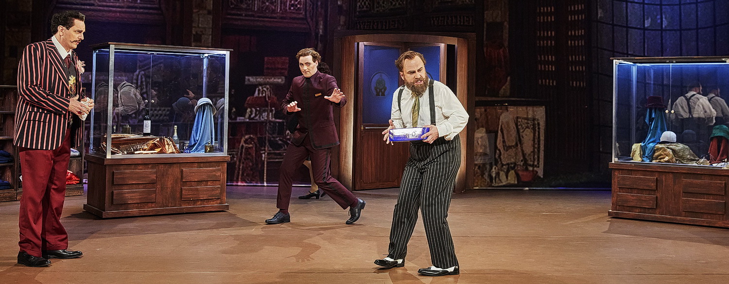 Dass das Mainfrankentheater Würzburg die Kurzoper nach langem Corona-Stopp für seine Blaue Halle ausgewählt hat, erweist sich als Glücksgriff. Regisseurin Annika Nitsch belässt die Handlung in den so genannten Goldenen Zwanzigern, und die Ausstattung aus dieser Zeit von Feng Li unterstützt diesen Eindruck, sichtbar am Warenhaus-Interieur oder glitzernd gewandeten Schaufensterpuppen. Immer wieder erinnern die Songs, Chansons und schrägen, leicht jazzigen Musikstücke, schwungvoll gespielt vom Philharmonischen Orchester unter Gábor Hontvári an das, was damals in den vielen Unterhaltungstempeln der Metropole Berlin zum Amüsement des Publikums erklang. Doch hinter dem scheinbar harmlosen Spaß an dubiosen Verkaufspraktiken im Warenhaus Wertheim steckt massive Sozialkritik, an hierarchisch verkrusteten Strukturen, an hemmungslosem Gewinnstreben, und auch die kommenden schlimmen Zeiten des braunen Terrors sind irgendwie schon zu ahnen. Die Inszenierung verstärkt das noch durch viele kleine Andeutungen. Denn der Herr Plim ist Jude, und er wird von Direktor und Personalchef nur dazu angestellt, die übersteigerten Ansprüche der Kunden dadurch zu besänftigen, dass der angeblich Verantwortliche dafür, also Herr Plim, scheinbar fristlos entlassen, aber danach immer wieder beschäftigt wird. Auf ihn prasseln also die Anschuldigungen der Käufer ein; er fungiert als Blitzableiter, so wenn sich die Präsidentin des Hausfrauenverbandes darüber beschwert, dass sie zu ihrem Essgeschirr nicht den passenden Nachttopf bekam, oder wenn ein männlicher Kunde es skandalös findet, wenn der Selbstbinder nicht von selbst funktioniert und eine Verkäuferin sich weigert, vor ihm einen Seidenschlüpfer anzuprobieren, oder auch wenn eine illustre Kundin es als Frechheit empfindet, dass ihr ein Knopf nicht zugeschickt wurde. Die von der Direktion bestellten Reaktionen von Herrn Plim reichen von devot, zerknirscht über Mitleid heischend bis unverschämt – aber alles wirkt nicht wie gewünscht. So soll er nun wirklich entlassen werden. Doch durch seine Tränen erreicht er seine Wiedereinstellung. Leider aber ist die „Moral“ der Geschichte durch die Inszenierung etwas zu dick aufgetragen, wenn alle Mitwirkenden nach dem unwahrscheinlichen, aber wohl eigentlich ironisch gemeinten Happyend Plakate hochhalten mit den heute üblichen Protest-Aufschriften. Kritik an Menschen verachtendem Verhalten ergibt sich von selbst aus dem Stück.