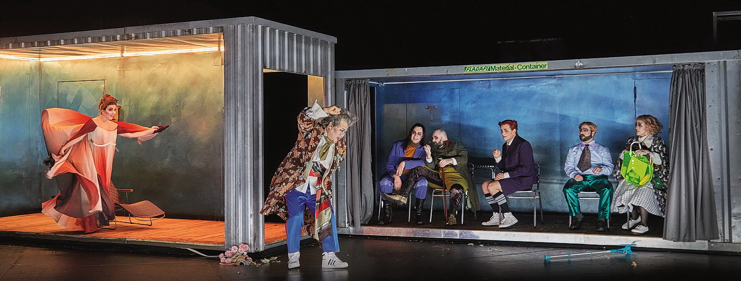 Irritierend aber ist zuerst einmal die Handlung. Zwei Container werden auf der Bühne dabei ständig hin- und hergeschoben, ebenso machen die anfangs recht seltsam bis skurril-trashig erscheinenden Kostümierungen und Aufmachungen der Personen durch Ausstatterin Julia Katharina Berndt das Geschehen zunächst nicht verständlicher. Mit dem Verlauf der grotesken Handlung aber lichtet sich alles, auch als die metallenen „Einhausungen“ sich öffnen, mit einem Vorhang an Theater-Auftritte erinnern. Nur die Hauptfigur Emilia Marty entspricht mit ihren schwebend flatternden Gewändern der Selbstdarstellung einer Diva des Gesangs. Durch die lebendige Personenregie von Nina Russi erschließt sich die Diskrepanz zwischen ihrem verletzlichen Innenleben, ihrer nach außen gezeigten Härte, ihrer abweisenden Haltung und dem Unverständnis ihrer Umgebung; diese nimmt mit eigenen Interessen an ihrem Leidens- und Lebensweg teil, glaubt ihr nicht, dass sie über 300 Jahre immer wieder die äußere Hülle und ihren Namen wechseln konnte und dass sie nun mit Hilfe eines Anwalts und eines Rechtsvermittlers an ein griechisches Dokument kommen will, das sich allerdings im Besitz des Jaroslaw Prus befindet. Der Preis dafür ist, dass sie sich dem unangenehmen Grundbesitzer hingibt. Dessen Sohn Janek, in sie verliebt, begeht deshalb Selbstmord. Emilia ist nun ihres langen Lebenswegs müde; ihr Urenkel und ein ehemaliger Liebhaber lassen noch einmal Stationen ihres Daseins aufleuchten. Sie aber will das Experiment für Unsterblichkeit, das einst ihr griechischer Vater an ihr – erfolgreich – ausprobiert hat, nicht weiter fortsetzen. Sie wählt den Tod als Befreiung. Auch die Übrigen begrüßen das als eine humane Lösung, als selbstbestimmtes Glück oder Unglück. Dank der Regie pendelt die Opernhandlung schlüssig zwischen vordergründiger Science-Fiction und real menschlicher Problematik mit dem Schwerpunkt auf existenzielle Fragestellungen, hintergründig und irgendwie doch mit leichter Hand unterhaltend.