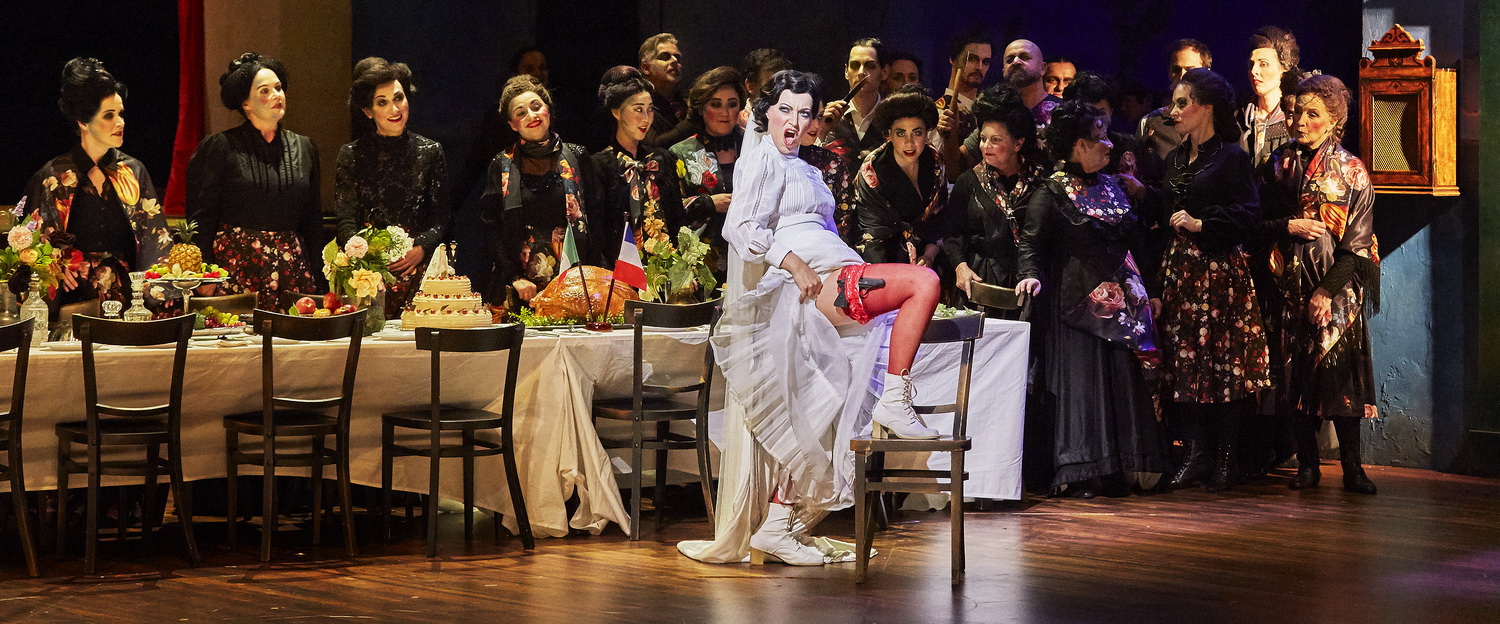 In Würzburg kommt es nun in der französischen Originalfassung auf die Bühne des Mainfranken-Theaters; nur die Palermo-Arie des Procida wird italienisch gesungen. Dem jungen Regisseur Matthew Ferraro gelingt bei seiner lebendigen Inszenierung in Zusammenarbeit mit der stilsicheren Kostümbildnerin Carola Volles und dem geschickten Lichtdesign von Roger Vanoni ein großer Wurf. Er sieht das Ganze als großen Abenteuerroman, wie er im 18. und 19. Jahrhundert üblich war, denn er beinhalte eine Revolution, Briefe von Verstorbenen, Vaterschafts-Überraschungen, Attentats-Versuche, Fast-Hinrichtungen, Kerkerszenen und das große Thema Patriotismus gegen Liebe. Die Spannung wird dabei mittels unverbundener Kontraste auf die Spitze getrieben, was eigentlich auf Dauer ein wenig ermüden kann. Ferrano siedelt das Geschehen in eine Umbruchszeit an, in die Zeit unmittelbar vor dem Ersten Weltkrieg, in der verschiedene Systeme politisch aufeinanderprallen. Das sizilianische „Volk“ tritt dabei in strengem Schwarz auf, mit den typischen Hochsteckfrisuren der Frauen und langen Röcken; die französischen Soldaten tragen blaue Uniformen. Nur Herzogin Hélène, deren Stellung im ganzen Durcheinander um die Herrschaft irgendwie unbestimmt scheint und die dauernd Rache für ihren ermordeten Bruder einfordert, erscheint in einer Art Morgenmantel über einem elegant fließenden Kleid. Alles findet statt in einem All-Raum mit hohen Fenstern, bröckeliger Basis und einer Art Bühnen-Tor mit Vorhang im Hintergrund. Verschiebbare Elemente verwandeln ihn in ein Palast-Interieur, in eine Krypta, den Vorhof des Gefängnisses oder einen Kerker. Die Gegensätze zwischen Unterdrückten und Unterdrückern zeigen sich gleich zu Anfang. Vorgeführt wird den Sizilianern ein Film über die Schönheiten Frankreichs; nur die Soldaten jubeln darüber, das Volk empört sich. Als Hélène gezwungen wird, ein Lied vorzutragen, singt sie vom Sturm im Meer; es ist indirekt eine Aufforderung zum Umsturz. Die Einheimischen verstehen das und schöpfen Hoffnung, wechseln ihre Trauerkleidung, ziehen buntgeblümte Tücher über.