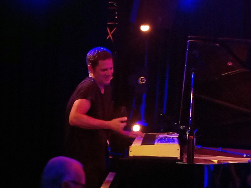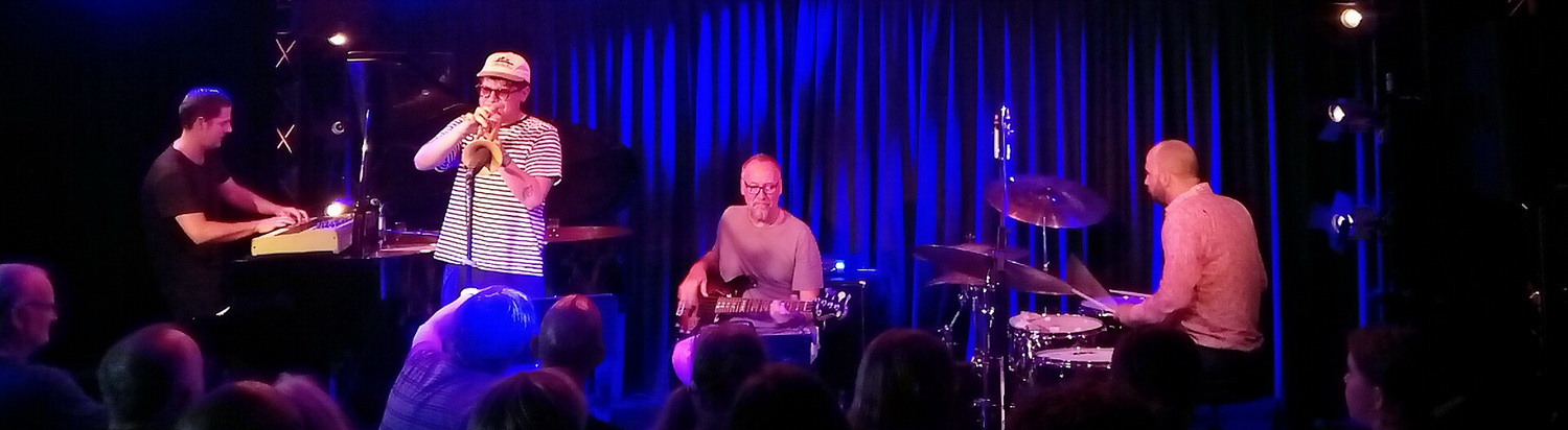 Die vier Vollblut­jazzer stehen nun zum ersten Mal gemeinsam auf der Bühne und entfachen ein musika­li­sches Feuerwerk nach dem anderen, unter­brochen nur von einer Pause, um sich von der an diesem Abend vorherr­schenden Tropen­hitze drinnen wie draußen ein wenig zu erfri­schen. Power pur ohne Unterlass liefern sie ab. Stehen zwischen­durch lyrisch-ruhige Momente und verhaltene Intros im Vorder­grund, sind dennoch immer leise sorgfältig-treibende Rhythmen, markante Harmonien oder groovende Basstöne mit dabei, musika­lische Ruhepole nicht zuzulassen. Präsen­tiert wird eine große Mischung aus der guten alten Zeit des Jazzrock, des Fusionjazz, durch­setzt mit einer gehörigen Portion aus Funk der 1970-er und 1980-er Jahre. Latent schimmert zu rockigem Schlagzeug der legendäre Pianist Joe Zawinul oder die Slapt­echnik des US-ameri­ka­ni­schen Bassisten Stanley Clarke durch. Auch lässt die legendäre Band Weather Report schön grüßen. Doch damit nicht genug. Denn die Zeit ist nicht stehen­ge­blieben. Hinzu gesellen sich komplexe Harmonien, teils chroma­tisch gerückt, aus dem Flügel hervor­kom­mende Teppiche an Akkord­re­pe­ti­tionen, Verlassen von rein tonalen Klängen gerade bei den hochvir­tuosen Soli der vier. Ein einziger ostinater, von Babiks Synthe­sizer erzeugter Ton reicht aus für sich gewaltig steigernde Dynamiken und rhyth­misch-kernigen Funk. Auch simple Drei-Ton-Motive reichen für solch treibende Prozesse aus. Das alles kontras­tiert balladesk-lyrische Melodien seitens des Pianisten und Trompeters mit seiner warmen bis scharfen Tongebung, die sich allmählich hochmu­si­ka­lisch-kreativ vom Piano hin zum dreifachen Forte druckvoll entwickeln.
