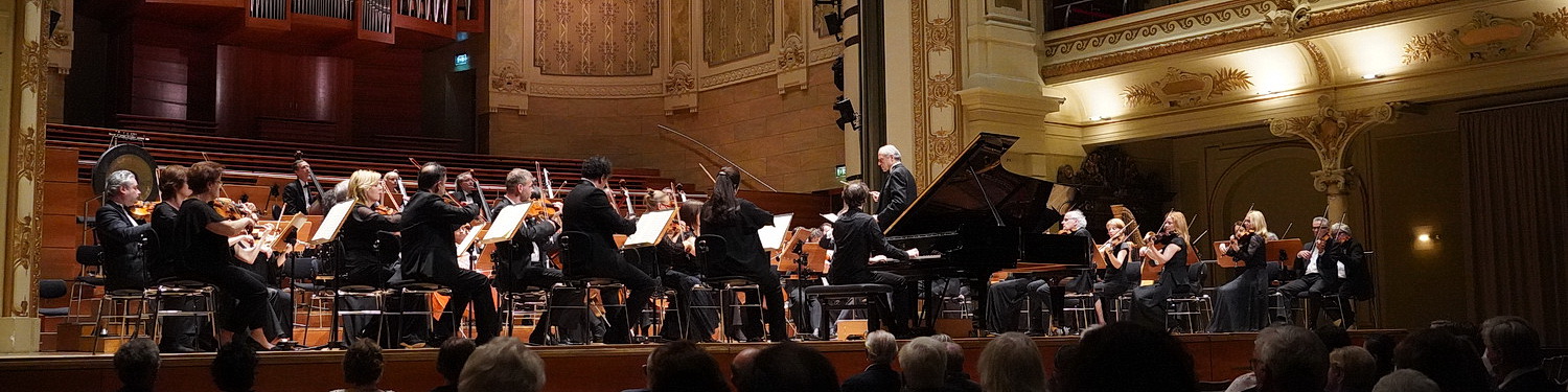 Die Noten des vierten Klavierkonzerts in G‑Dur, op. 58, aus der Feder von Ludwig van Beethoven liegt auf den Pulten der Musiker, die in klassischer alter Tradition der „Deutschen Aufstellung“ Platz nehmen. Diese Sitzanordnung der Streicher war bis zum Beginn des 20. Jahrhunderts überall alltäglich: Die ersten und zweiten Geigen sitzen sich gegenüber, die Bratschen wie gewohnt neben den zweiten Geigen und die Celli neben den ersten Geigen. Als kleine Abweichung befinden sich wie bei den Wiener Philharmonikern die Kontrabässe nicht hinter den ersten Geigen, sondern hinter dem gesamten Orchester. Den Komponisten der Klassik und Romantik kannten die damit einhergehende unverwechselbare Akustik genau und komponierten dementsprechend. So kommen die dadurch beabsichtigten klanglichen Effekte voll zum Tragen.