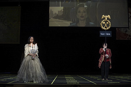 Die Auswahl vieler Fragmente lässt Cage mit Zufallsoperationen aus buddhistischen I‑Ging-Orakeln vornehmen, so dass die Positionen der zehn Sänger auf den 64 Spielfeldern der Bühne mit ihren vielfältig kombinierten Montagen und Collagen nicht ausschließlich der Entscheidung des Regisseurs überlassen bleiben. Für die 26 Szenen des ersten Teils greift Ausstatterin Katrin Wittig tief in den Kostüm‑, Requisiten- und Bühnenbildfundus des Theaters und zaubert eine bizarre Mixtur aus theatralischen Elementen, die in ihrer Buntscheckigkeit jeden Ansatz zu einer geschlossenen dramaturgischen Struktur unterbinden.