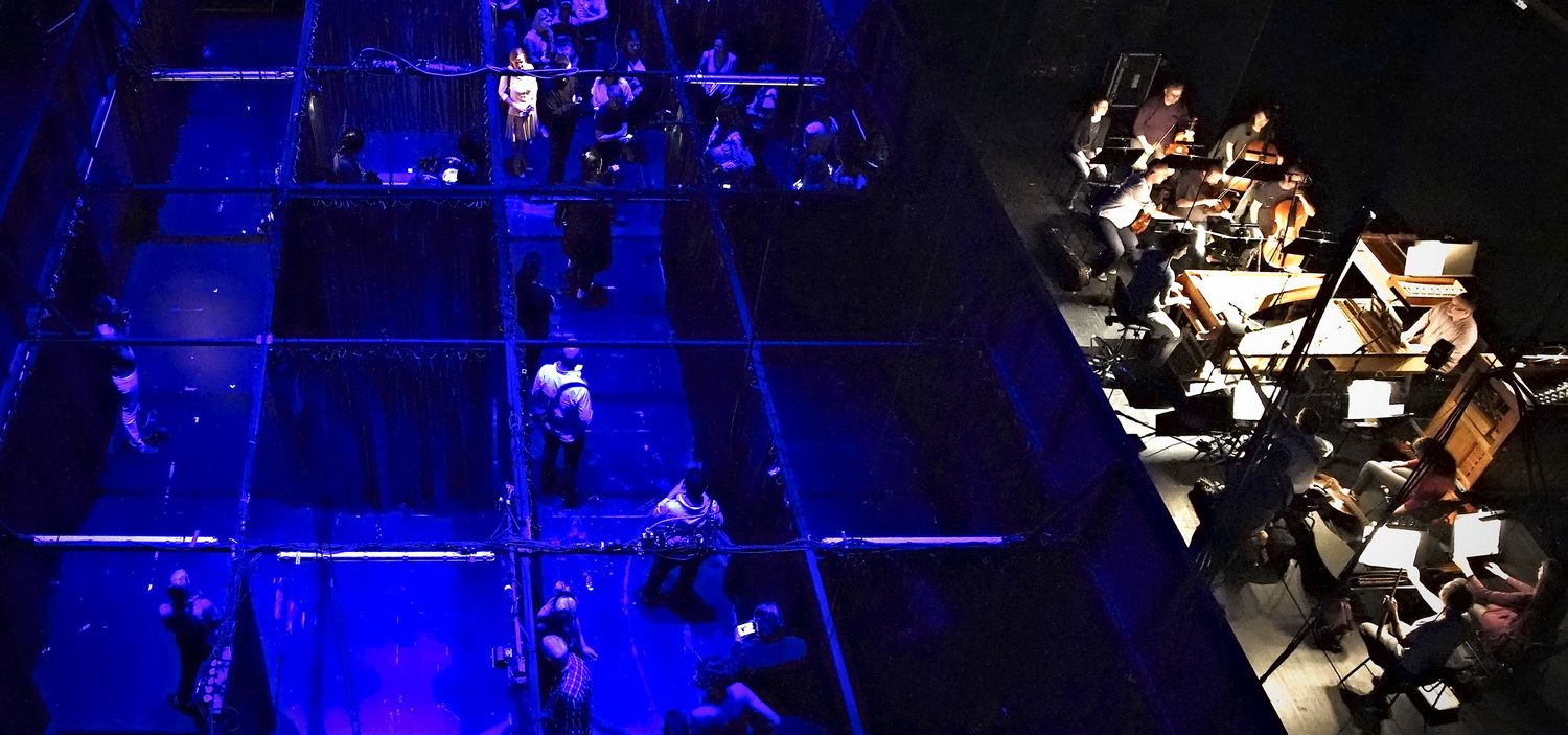 Was erwartet den Besucher des 70-minütigen Werks aus dem Jahre 1625 in Wuppertal? Zunächst muss er über ein gutes Steh- und Gehvermögen verfügen und sollte nicht unter Platzängsten leiden, denn er ist den ganzen Abend auf der Bühne gezwungen, sich durch ein Labyrinth schwarzer und enger Kammern zu zwängen, wenn er die Darsteller live erleben möchte. Da wird es schnell eng, und meist steht man vor leeren, schwarzen Wänden. Wer mehr sehen will, muss die heruntergeladene App auf seinem Handy oder Tablet aktivieren, die Einblicke in verschiedene Kämmerchen erlaubt und auch die deutschen Übertitel bereithält. Mit dem Ergebnis, dass viele Besucher am Bühnenrand nur noch auf die App schauen oder sich damit begnügen, dem Orchester im Bühnenhintergrund zuzusehen. Bequem ist das nicht. Und eine Handvoll Stühle reichen nicht aus, um nicht nur älteren Besuchern ein wenig Rast zu bieten.