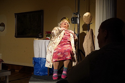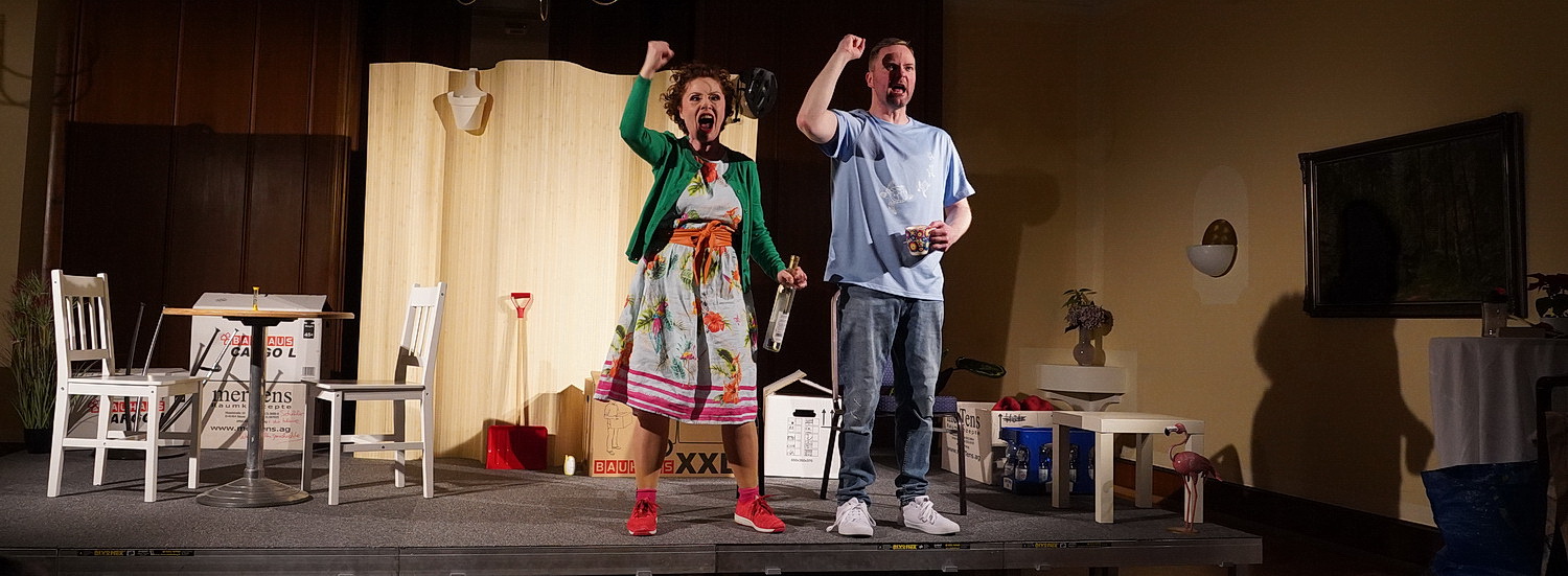 Eric Haug hat die Regie übernommen. Er hat den „Geräteschuppen“ mit etlichen Umzugskartons, einem Tisch mit zwei Stühlen und nötigen Requisiten vollgestellt. Vor der Bühne ist auf einem Podest ein Sessel aufgebaut. Denn Haug belässt es nicht bei dem Zweipersonenstück, bei dem eine dritte Stimme von der Festplatte kommt, sondern lässt die Großmutter tatsächlich auftreten. Ein gelungener Schachzug, wie sich gleich zeigen wird. Mit Bravour meistert der Schauspieler und Regisseur Raum und Spiel auf der Bühne. Er verschwindet nicht, wie üblich, nach der Premiere, sondern übernimmt in den folgenden Aufführungen auch gleich noch die Technik.