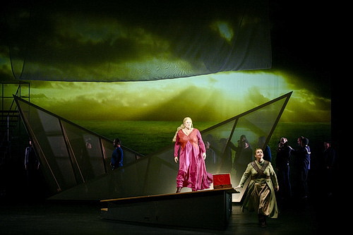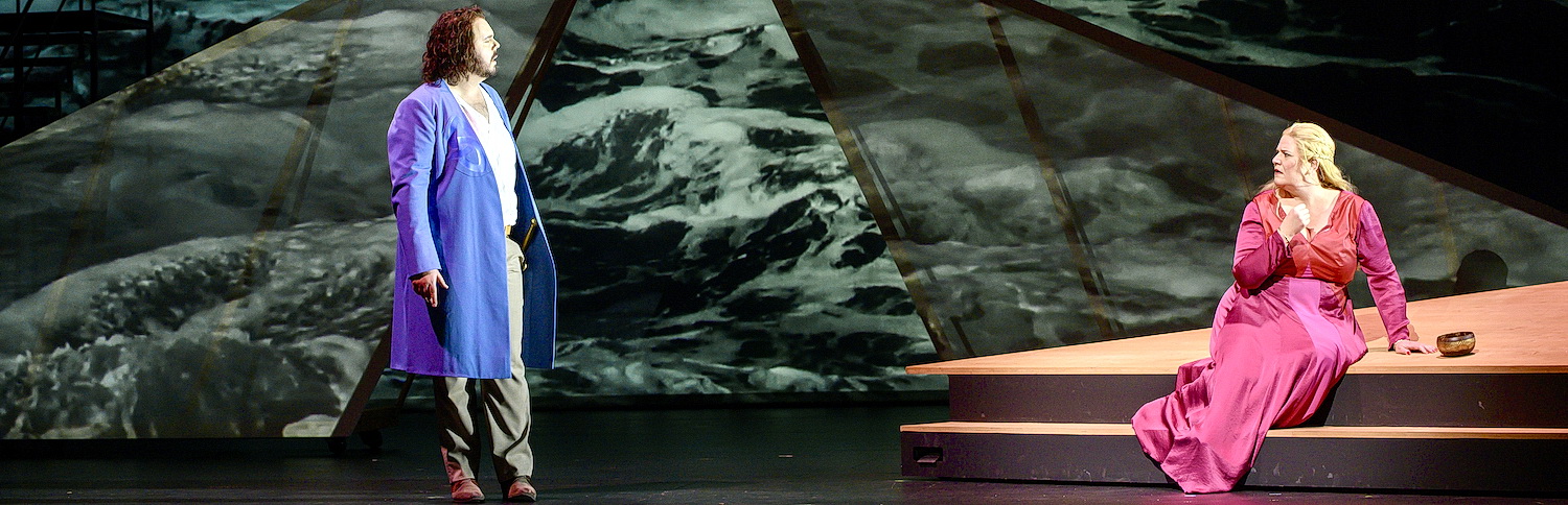 In der Neupro­duktion an der Oper Wuppertal werden solche Fragen nur partiell beant­wortet. Eindeutig siegt die Musik über die Bühne. Martin Andersson, der für das Konzept und Regie Video verant­wortlich zeichnet, setzt auf starke schwarz­weiße Video­hin­ter­gründe, die sich mit der Kraft der Bilder von Wellen und des Meeres beschäf­tigen. Die Wellen der Emotionen, die Wellen, die die Strände von Irland und Cornwall umspülen, die Wellen, die Leben und Tod bringen – das sind einige der Assozia­tionen, die dem Zuschauer geboten werden. Edison Vigil, der für die Regie zuständig ist, setzt die stark intro­ver­tierte Sprache der Charaktere in nur steife Rampen­regie um. Eine inter­per­sön­liche, psycho­lo­gische Deutung bleibt aus. Dabei bekommt er wenig Unter­stützung vom Bühnenbild von Lukas Noll: einfache, dreikantige Segel im ersten Akt deuten das Braut­schiff an, kantige Klippen in einer düsteren Hölle den dritten. Dafür liefert Andersson einen üppigen Tropenwald für die Liebes­nacht im zweiten Akt, wo die Liebenden auf einer metal­lenen, mit Runen dekorierten Fläche kurz und sehr sittsam zuein­ander finden. Mit der Ankunft von König Marke verbrennen die Tropen bildge­waltig und hinter­lassen eine Aschen­wüste. Dorothee Joisten entwirft Kostüme, die dekorativ, aber wenig vorteilhaft sind.