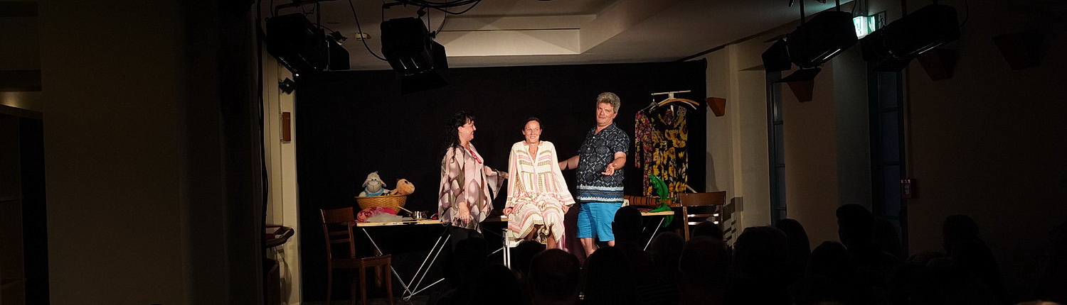 Warum man den Besuch dieses Stücks Menschen empfehlen muss, die nichts anderes wollen, als sich gut unter­halten zu lassen, die Welt mit ihrem Elend mal außen vorlassen und herzhaft lachen wollen, liegt eindeutig an den Leistungen des Ensembles. Die Aufgaben des Licht- und Ton-Technikers Martin Jansen sind am Abend sehr überschaubar, aller­dings hat er im Vorfeld die gesamte Technik von Null an ein- und aufbauen müssen. Und das funktio­niert alles hervor­ragend. Da können die Darsteller sich von Anfang an im rechten Licht sonnen. Allen voran Melanie Spielmann, die im weiten Kleid und Turnschuhen Franziskas Geschichte erzählt, deren Ende allzu vorher­sehbar ist. Aber was sie in zwei Stunden leistet, ist mehr als aller Ehren wert. Schließlich hat sie nicht nur Text und Spiel zu beherr­schen, sondern auch die Aufgabe, die beiden Kollegen zu ihren Rollen zu bitten. Sie ist also diejenige, die das Stück so gut kennen muss wie kein anderer, und sie ist glänzend vorbe­reitet. Da wird es zur Lust, sie zu erleben. Ebenfalls ein beson­derer Gewinn ist – wie immer – Ilka Schäfer. Die „Kodder­schnauze mit Herz“ hat ihre Schlag­fer­tigkeit über die Jahre souverän ausgebaut. Da wird jeder Satz zur gesetzten Pointe, immer gut mit Lebens­er­fahrung unter­füttert. Ihr Kontakt zum Publikum ist Legende.