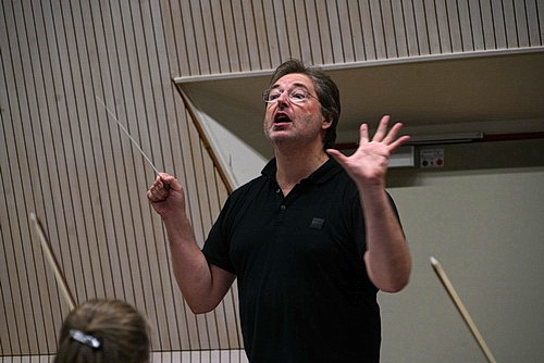 Bevor die beiden Sänger zum Einsatz kommen, steht erst einmal die Ouvertüre zur Operette Cagliostro in Wien von Johann Strauss auf dem Programm. Wer Steinitz schon einmal am Pult erlebt hat, weiß, dass das Orchester bei ihm professionell und immer sehr entspannt wirkt. Und schon in den ersten Minuten in der funktionalen, schmucklosen Halle wird klar, wie das zustande kommt. Steinitz gehört zu der Generation von Dirigenten, die einen kollegialen Umgangston pflegen. Er begreift sich als primus inter pares und wird als solcher auch akzeptiert. Man kann über Hierarchien in Orchestern lange diskutieren, aber letztlich ist es hilfreich, wenn es einen gibt, der die Zügel in der Hand hält. Die Frage ist, wie er mit diesen Zügeln umgeht, und da gehört Steinitz eindeutig zu denen, die es können. Hier steht keiner am Pult, der sein Ego auf Kosten anderer ausleben muss oder Arbeitsergebnisse mit Druck erzielt, weil ihm nichts Besseres einfällt. Stattdessen arbeitet er auf Augenhöhe, sieht seine Musiker nicht als Erfüllungsgehilfen, sondern nimmt sie in die Verantwortung. „Macht’s ein bisschen wienerischer“, sagt er den Tubisten. Wie macht man das? Na, es ist die Aufgabe der Instrumentalisten, das zu wissen. Zwischenfragen und auch mal kleinere Diskussionen gehören selbstverständlich dazu. So gestaltet sich die Probe nicht als Fronarbeit, sondern recht lebhaft – und am Ende gelingt es dem Team, die gewünschte Stimmung herzustellen.