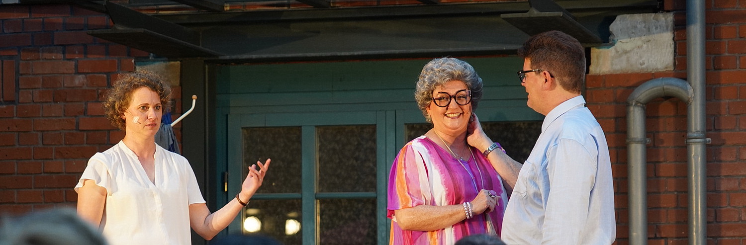 Nach der Pause geschieht, an das schon niemand mehr dachte. Der Regen setzt ein. Während die Zuschauer sich unter Mauervorsprünge flüchten, spielen die drei Darsteller unbarmherzig weiter. Eine Glanzleistung, die man gar nicht ausreichend würdigen kann. Das Publikum ist hin und weg. Später, als die Besucher längst gegangen sind, zieht Schäfer ihren Fifi vom Kopf und schüttelt ihn aus. „Hey, pass mit der Technik auf!“ ruft Jansen. „Na klar, habe ihn ja extra in die andere Richtung ausgeschüttelt“, antwortet die pfiffige Schauspielerin – und legt die feuchte Perücke auf die technischen Geräte. Hört das mit dem Lachen überhaupt nicht mehr auf?