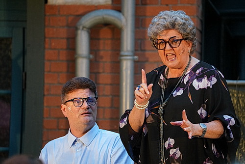 In diesem Jahr hat Stößel für seine Open-Air-Veranstaltungen das Stück Zurück zum Happy End von Frank Pinkus ausgewählt und inszeniert. Der Autor hat eine interessante Ausgangssituation gefunden. Bettina Kern und Christian Meyer mit ey treten auf die kleine Bühne und küssen sich. Sie stehen vor dem Standesamt und küssen sich, als sie das Publikum bemerken. Wie sollen sie denn jetzt damit umgehen? Anstatt sich unauffällig zurückzuziehen, beschließen sie, dem Auditorium von ihrer Beziehung und davon zu erzählen, was sie vor das Standesamt geführt hat. Kern schreibt an ihrer Doktorarbeit im Fach Germanistik über Fontane, während Meyer Personalleiter beim Bezirksamt ist. Rückblickend erzählen sie nun von verschiedenen Stationen ihrer Beziehung aus der jeweils eigenen Sicht. Schnell wird klar, dass Meyer ein liebenswürdiges, aber in Liebesdingen völlig unerfahrenes Muttersöhnchen ist, das sich selbst gern als Held sieht. Kern sieht in ihm eher den niedlichen Lebensfremdling, der ihr zunehmend Spaß bereitet. In den folgenden zwei Stunden hagelt es Klischees, aber unterschwellig, und das macht den Wert des Stücks aus, bleibt die Frage, warum Mann und Frau eine Beziehung so unterschiedlich wahrnehmen und trotzdem auf die Idee kommen, dass die unterschiedliche Wahrnehmung ihrer Begegnung für ein lebenslanges Band reicht. Da mag der Besucher so manche Frage mit nach Hause in die eigene Ehe nehmen. Und hier sind viele Besucher, die dem Augenschein nach jahrzehntelange Beziehungen erlebt haben.