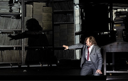 Ähnlich wie in der Genfer Inszenierung von Matthias Hartmann bringt Kosky die zeitweilig starre Handlung in den ersten zwei Akten mit Hilfe von verschiebbaren Hochregalen in Bewegung. Bei ihm sind sie mit Büchern und Unmengen von Akten bestückt, was sich für den jungen Studenten als Labyrinth entpuppt. Dass die Bücher sprechen und singen, ist nicht satirisch gemeint, sondern der Tatsache geschuldet, dass in Zürich das Orchester sowie der Chor im nahe gelegenen Probelokal spielt und singt und per Glasfaserkabel direkt in den Opernsaal gestreamt werden. Boris Godunow ist auch eine Chor-Oper, und Kosky findet mit dem Kniff der plappernden Bände ein probates Mittel. Einerseits wird für die Musiker die Ansteckung mit dem Corona-Virus minimiert, andererseits hat das Zürcher Opernhaus auf diese Weise mehr Spielraum für die behördlichen Verordnungen.