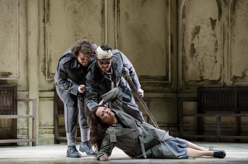 Guth gelingt mit seiner im Juni 2011 erstmals am Opernhaus Zürich gezeigten Inszenierung eine kluge Anschauung, die Wagners lyrisch-pathetisches Bühnenweihfestspiel in die Zeit nach dem Ersten Weltkrieg setzt und den Bogen spannt bis hin zur Machtergreifung Adolf Hitlers im Jahr 1933. Der Gefahr des allzu festlichen Rampensingens wirkt der Regisseur von Anfang an mit den Mitteln einer Drehbühne entgegen. Wir sehen eine herrschaftliche Villa, die schon bessere Zeiten erlebt hat. Der stete Zerfall des Palastes, ebenso ein Merkmal Loyscher Lesart, erinnert bei diesem Gang durch die Nachkriegsjahre an ein Schauerschloss, wie man es aus Gruselfilmen kennt. Es spukt jedoch in den Köpfen der Kriegsversehrten, die ohnehin schon an Krücken gehen oder von Krämpfen geplagt sind.