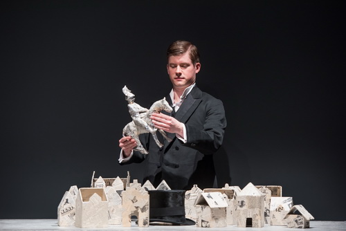Wie schwierig das mit der vermeintlich richtigen Haltung ist, zeigt gleich das erste Stück, mit dem das Festival eröffnet. Im April vergangenen Jahres zeigte das Göttinger Theater seine Studio-Version von Der Untertan nach Heinrich Mann in der Regie von Theo Fransz. Dabei handelt es sich eher um ein Surrogat denn um eine Wiedergabe des Buches, das den Inhalt auf rund 80 Minuten komprimiert. Einerseits ist die Zeit vollkommen ausreichend, um den Konflikt der geistigen Haltung aufzuzeigen, andererseits wird das Stück stark textlastig, um die Handlung verständlich zu machen. Da überschlagen sich schon mal die Worte im Chorus, und die Spielszenen geraten arg kurz. Bettina Weiler hat sich um Bühne und Kostüme gekümmert. Mit denkbar knappen Mitteln gelingt es ihr, das Geschehen zu verdeutlichen. Links am Bühnenrand ein Klavier, dahinter eine „Garderobenecke“, in der viele Accessoires untergebracht sind. Rechts ein überdimensionaler Bilderrahmen, der ermöglicht, historische Videos aus der wilhelminischen Zeit zu zeigen, und als halbtransparente Fläche, hinter der Schattenspiele stattfinden können. In der Mitte ein stabiler Tisch und ein paar solide, einfache Stühle, mit denen die verschiedensten Situationen dargestellt werden können. Die Kostüme sind in Schwarzweiß gehalten: Weiße Blusen und schwarze Anzüge mit Westen, die durch Überstreifen von Gehröcken oder Aufsetzen von Verbindungsmützen für blitzschnelle Rollenwechsel sorgen.