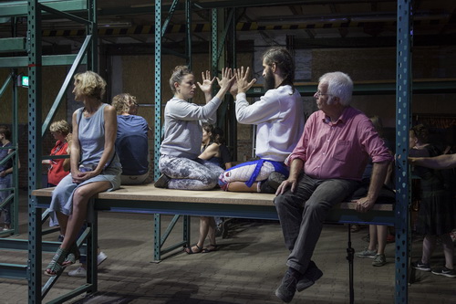 Es beginnt mit recht banal anmutenden szeni­schen Reflexen, die an die 1970-er Jahre erinnern. Ein schrott­reifer PKW wird mit Bändern, Blumen und Stoffen zu einer Flower-Power-Ikone geschmückt, auf kleinen Baggern und Gabel­staplern räkeln sich ein paar mutige Tänzer. Dann zieht der Besucher­strom in einer langen Prozession in die Werks­halle, die an den Seiten mit decken­hohen Gerüsten drapiert ist, durch die sich die Tänzer zunächst mit affen­ähn­licher Behän­digkeit hangeln.