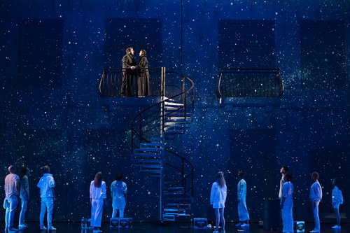 Unterstützt von Projektionen von dem vielbeschäftigten Duo Momme Hinrichs und Torge Moller, die auch für das praktikable und schnell verwandelbare Bühnenbild von teils suggestiv ausgeleuchteten Häuserkulissen, verantwortlich sind, werden aber auch magische Momente erzeugt: Etwa wenn Rodolfo am Schluss des ersten Aktes sein Soave fanciulla anstimmt und gemeinsam mit Mimi an der Spitze der Wendeltreppe steht, in violettfarbenes Licht getaucht, von Schneeflocken umschwirrt, wie schwebend und losgelöst von aller Erdenschwere. Beeindruckend ist auch die Verwandlung zum zweiten Bild, wo ein tiefer Raum mit der mehrstöckigen Kulisse des Café Momus zum Vorschein kommt.