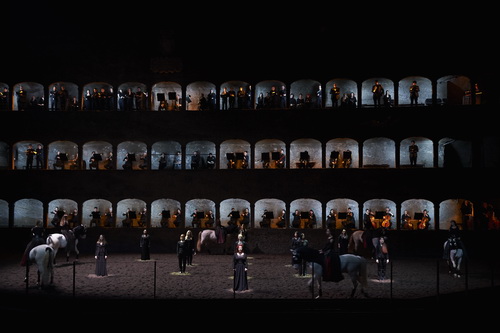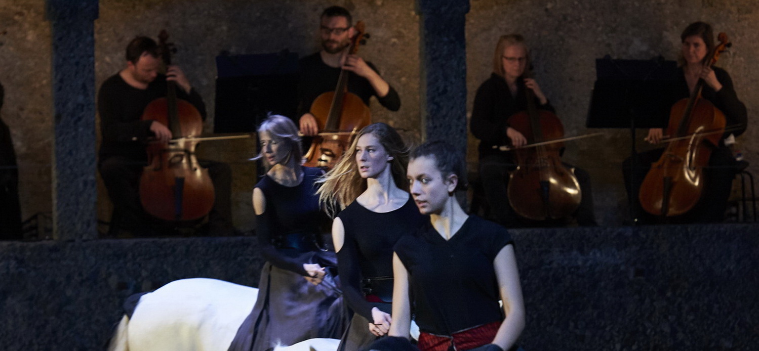 Kaum betritt der Zuschauer die Felsen­reit­schule, passend für die Aufführung gewählt, sticht schon der Duft von Pferdemist zur Einstimmung in die Nase. Chor, Solisten und Musiker stellen sich in den drei überein­an­der­lie­genden Säulen­gängen auf und bilden so bereits einen wirkungs­vollen harmo­ni­schen Hinter­grund. Pferde schnauben im Dunklen und werden zur Beruhigung im Kreis geführt. Marc Minkowski steigt auf das Dirigierpult, das sich am Bühnenrand direkt vor den Zuschauern befindet und beginnt mit dem Miserere für Alt, Tenor, Bass und Orgel von Wolfgang Amadeus Mozart. Der Cantus firmus ist erhaben, feierlich, ehrfurchtsvoll und leicht, die passende Einstimmung, gefolgt von der Begräb­nis­musik für Königin Caroline von Georg Friedrich Händel.  Das Pferde­ballett setzt mit einem Solo des Meisters Bartabas selbst ein. Im Spotlight dreht sich sein Rappe elegant um die eigene Achse, während der Reiter sich in seiner Trauer sein dunkles T‑Shirt über den Kopf zieht und langsam ausdrucksvoll seine Arme bewegt.  Mit einem erhabenen Aufmarsch der acht Reiter, liegend über den Pferde­rücken, beginnt die reiter­liche Inter­pre­tation von Mozarts Trauer­musik, dem Kernstück des Abends. Die Choreo­grafie vereint die Eleganz und Erhabenheit der edlen Tiere, ihre rhyth­mi­schen Bewegungen und die unter­schied­liche Ausdrucks­kraft in den verschie­denen Gangarten. Die Bewegungs­ab­läufe und Gesten der Reite­rinnen fließen damit zusammen, ihre ausschließlich langen Haarmähnen werden zur Entper­so­ni­fi­zierung mitein­be­zogen. Gefühlt spielt nicht der Einklang der Bewegung mit dem Rhythmus der Musik die entschei­dende Rolle, sondern die Inter­pre­tation des Gefühls, welches die Musik vermittelt. Übermäßige Ausschmü­ckung oder überzogene Wildheit fehlt in dieser ruhigen, in ständiger Bewegung fließenden Darstellung, die den Betrachter mehr und mehr in den Bann zieht und in den Leichenzug aufnimmt. Reiter­liche Zirkus­ein­lagen fehlen ebenso, sollen aber nicht die Ansprüche an die reiter­liche Quali­fi­kation schmälern. Bartabas bezieht alle Mitwir­kenden in sein Spiel ein. Auch Mitglieder des Salzburger Bachchores finden sich mitten unter den Pferden und bilden natür­liche Begren­zungen, um die sich die Pferde sicher und vorsichtig bewegen. Im abschlie­ßenden Ave Verum beweisen auch die Reite­rinnen ihre Gesangsausbildung.