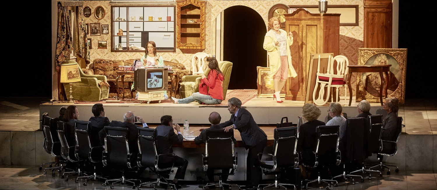 Es sind solche kleinen Gesten, die feinsinnig charak­te­ri­sieren und mit den Opern­be­su­chern die Kommu­ni­kation suchen. Die Bühne von Susanne Gschwender plaziert einen runden Tisch auf der Schnitt­stelle von Bühne und Puppenhaus. Um ihn versammelt sich eine Gesell­schaft in Geschäfts­kleidung zu Strate­gie­sit­zungen. Er verbindet den minima­lis­ti­schen Raumkörper Puppenhaus von Don Magnifico und seinen beiden Töchtern Clorinda und Tisbe sowie Angelina als Bühne in der Bühnen­ar­chi­tektur mit der Tischgesellschaft.