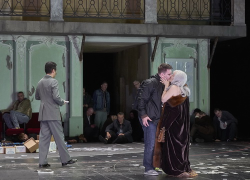 Das Arioso der Lisa nach der Pause entkleidet die Inszenierung ihrer liebeszauberischen Formstruktur. Wo im Libretto-Text steht – Lisa fällt ihm, German, in die Arme – hofft Lisa, auf einem Dachvorbau stehend, dass Germans Ermordung der Gräfin nur ein Opfer des Zufalls gewesen sein möge. Die das Eigentliche ihrer Liebe nicht berühren kann. German steht unten auf dem Hinterhof mit dem Blick zu ihr nach oben in scheinbarem Einverständnis, bevor er sich, von ihr abwendend, in Ekstase um den Verstand singt. Er sei jener Dritte, um „mit Gewalt zu erfahren, die Drei, die Sieben, das As.“