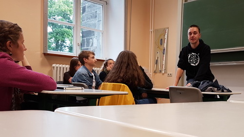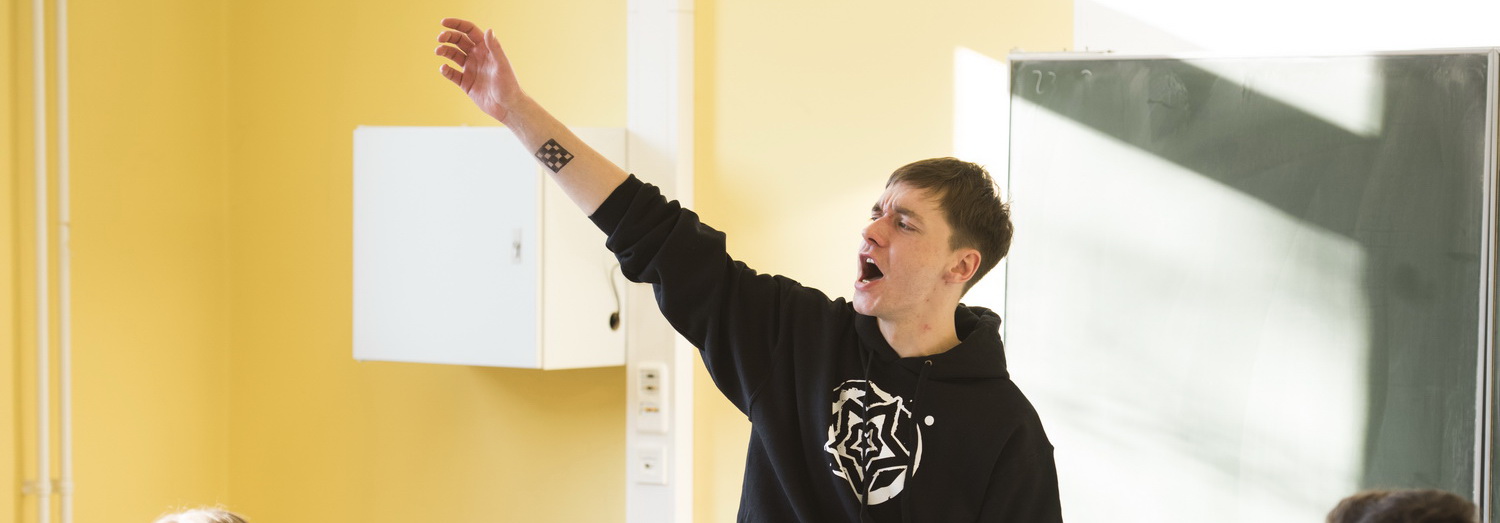 Vielleicht liegt es auch an dem Schauspieler, dass die Mädchen und der Junge wie gebannt seiner Erzählung lauschen, vollkommen in eine andere Welt abtauchen. Selbst die Erwachsenen kann er in die Geschichte mitnehmen, als hörten sie zum ersten Mal von Jonas‘ Schicksal. Die Schüler hängen an den Lippen des Erzählers. Roman Majewski gibt alles, überzieht, geht auf die Zuhörer zu, brüllt sie an, simuliert einen Boxkampf mit einer Schülerin, stottert, ist den Tränen nahe. Und erklärt, wie aus dem Hakenkreuz an seinem Unterarm ein Schachbrett wurde. Kein verstehendes Gelächter, sondern Betroffenheit.