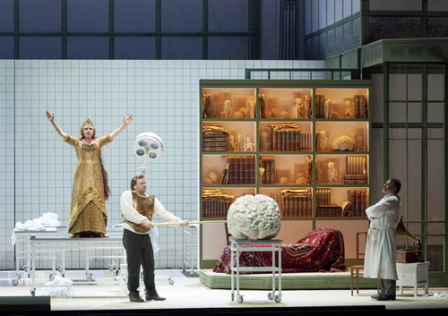 Parsifal in der Psych­iatrie also: Gurnemanz im weißen Kittel ist der Chefarzt, Grals­ritter sind die Assis­tenz­ärzte, die Knappen die Pfleger und Kranken­schwestern, der Chor die Patienten. Die ankom­mende Kundry wird gleich einmal von den Pflegern in ein Gitterbett gesperrt. Gegen Ende des Aktes wird sie mitsamt diesem Bett von Dr. Klingsor, ebenfalls ein Arzt, ein Pathologe, wie sich im zweiten Akt heraus­stellen wird, abgeholt und mitge­nommen. Klingsor betreibt Experi­mente, um die Toten wieder zu erwecken, mit Elektro­schocks und Schädel­boh­rungen. Irgendwo in diesem Grusel­ka­binett liegt auch Herze­leide, die Mutter von Parsifal. Im ersten Akt gibt es noch so manche Idee und Perso­nen­führung. Im zweiten und ganz besonders im letzten Akt versiegen die jedoch völlig, und es herrscht bald lähmende Statik. Auch wird im dritten Akt die Natur nur mit einer halbher­zigen, einge­spielten Projektion angedeutet. Es steigt in der bald nicht mehr nachvoll­zieh­baren Assozia­ti­ons­kette und den szeni­schen Absur­di­täten immer mehr die Ratlo­sigkeit, und es mehren sich unbeant­wortete Fragen, wie etwa, warum der Speer wie eine Strick­nadel in dem riesigen Gehirn steckt, aus dem ihn Parsifal heraus­zieht? Durch als das nimmt Hermanis dem Parsifal all seinen Mythos und seine Ernst­haf­tigkeit. Das Spiel mit den Zeiten, Räumen und Stilen mutet letztlich nur dekorativ an. Die Verlegung der Erlösungs­ge­schichte in die Spital­sphäre bleibt am Ende inhaltlich unbegründet.
