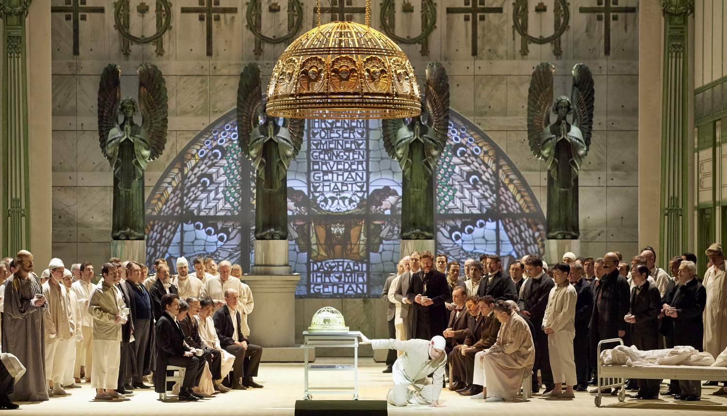 Und so lässt der Regisseur das Bühnen­weih­fest­spiel, wie angekündigt, was auch nicht unbedingt eine neue Idee ist, in einer Nerven­heil­an­stalt im Fin de Siècle, also zum Ende des 19. Jahrhun­derts, spielen. Aber nicht in irgend­einer, sondern genau verortet in Wien auf der Baumgart­n­erhöhe. Dazu lässt er ein pracht­volles Bühnenbild im Jugendstil bauen, sehr ästhe­tisch, vielleicht etwas überladen und nicht so elegant wie das Original des Spitals vom Jugendstil-Archi­tekten Otto Wagner. Die Innen­kuppel der Kirche am Steinhof senkt sich immer wieder wie eine Art riesige Lampe in das Geschehen hinab. In diesem Einheits­büh­nenbild gibt es immer wieder Zwischen­wände, die herab­ge­senkt oder herein­ge­schoben werden, die auch teilweise als Projek­ti­ons­wände für das Opern­li­bretto in altdeut­scher Schrift verwendet werden, was aller­dings sehr entbehrlich erscheint.