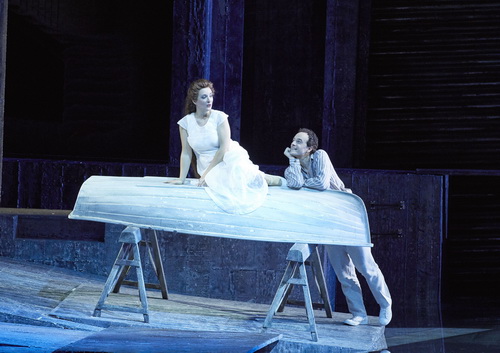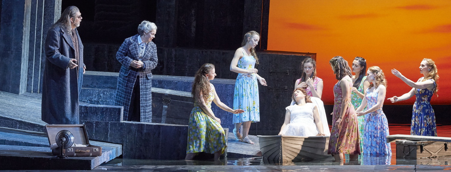 Ein Großteil der Bühne ist mit einem mit Wasser gefüllten Pool ausge­füllt. Das Wasser ist hier allein der Bote der Ästhetik. Es schimmert und glitzert und wirft immer wieder durch raffi­niert einge­setztes Licht magische Reflexe, die an der Decke und an den Mauern tanzen. Mittendrin sitzt Mélisande wie eine Rästelnixe in einem Kahn und lässt sich von dem bis zur Brust im Wasser watenden Pelléas ziehen. Krank sind hier fast alle, neben Arkel sieht man auch den dahin­sie­chenden Vater, Golaud unter­nimmt mehrere halbherzige Selbst­mord­ver­suche mit dem Gewehr, Ynold mit Glasscherben. In einer fein ziselierten Perso­nen­führung wird das Geschehen sehr realis­tisch in Szene gesetzt.  Aller­dings hätte man sich von der Bühne ein wenig Sinnstiftung oder ein wenig zusätz­liche Sinnlichkeit gewünscht – die verharrt aller­dings in diesem einzigen dunkel­grauen Bild und verwechselt Symbo­lismus zu oft mit plumper Symbolik. Zu viele Zwischen­vor­hänge nach jeder Szene hemmen den Fortgang des ohnehin spärlichen Geschehens. Eine technische Panne mit einem Zwischen­vorhang sorgte überdies für eine plötz­liche Unter­bre­chung bei der Premiere. Zum Schluss verfällt der Regisseur auch noch zu sehr dem Kitsch, wenn die gestorbene Mélisande aufrecht im Kahn stehend, begleitet von mehreren bunt geklei­deten Frauen in einen sich öffnenden Postkarten-Sonnen­un­tergang fährt.