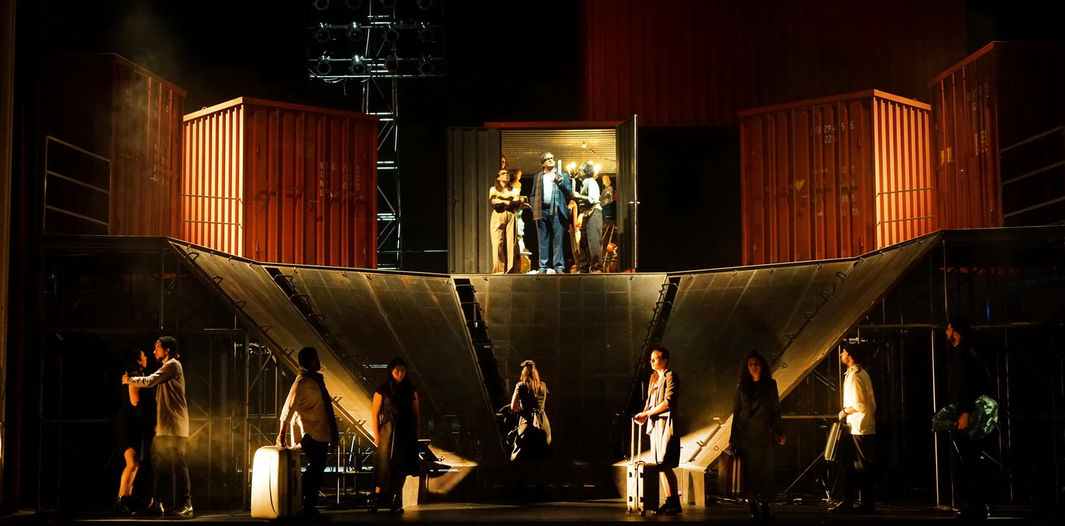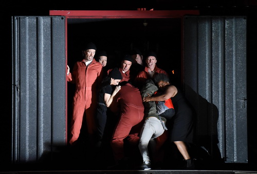 Die Bühne von Volker Hintermeier besteht aus zwei Stockwerken. Arenaartig steigen Steilwände, an denen kein Hinaufkommen ist, vom Bühnenboden auf. Die obere Ebene ist mit orangefarbenen, multifunktionalen Schiffscontainern bestückt, in die Flüchtlinge gepfercht werden, die aber auch als Intendantenbüro dienen können. Im Hintergrund ist eine Art Flutlichtstrahler aufgehängt.